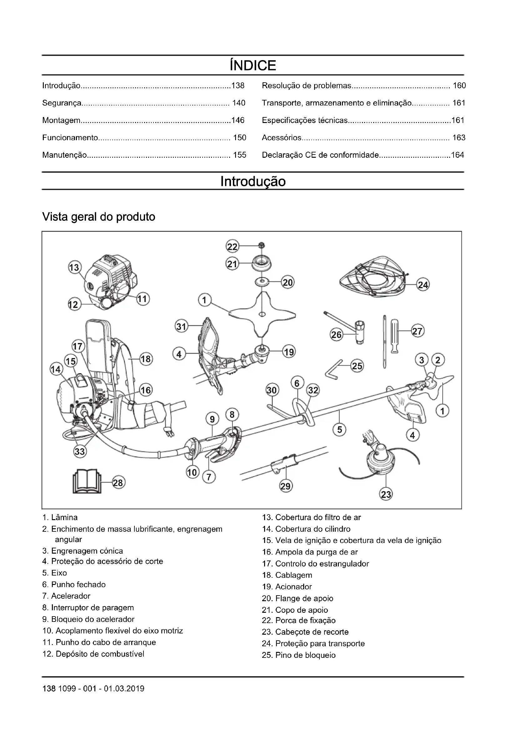 Solicite ajuda numa oficina autoriza- da. Depósito de combustível. Tipo de combustível errado. Drene o depósito de combustível e encha-o com o combustível correto. Vela de ignição. A vela de ignição está suja ou molha- da. Certifique-se de que a vela de igni- ção está seca e limpa. A distância entre os elétrodos da ve- la de ignição está incorreta. Limpe a vela de ignição. Certifique- se de que a distância entre os elétro- dos está correta. Certifique-se de que a vela de ignição tem um su- pressor. Consulte as especificações técnicas para obter informações sobre a dis- tância entre elétrodos. A vela de ignição está solta. Aperte a vela de ignição. 160 1099 - 001 - 01.03.2019O motor arranca mas para novamente Verificação Causa possível Procedimento Depósito de combus- tível Tipo de combustível errado. Esvazie o depósito de combustível e encha- o com o combustível correto. Filtro de ar O filtro de ar está obstruído. Limpe o filtro de ar. Transporte, armazenamento e eliminação Transporte e armazenamento