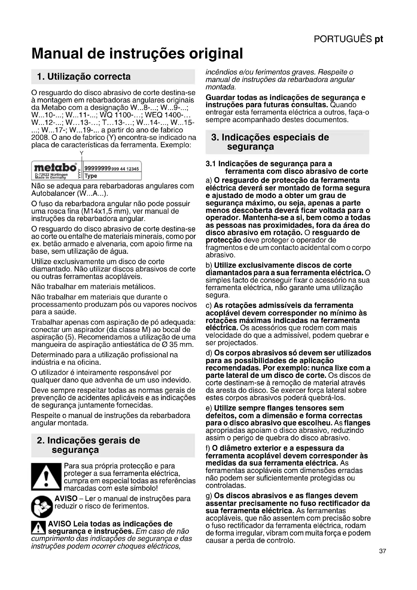 - -; W - a partir do ano de fabrico 2008. O ano de fabrico (Y) encontra-se indicado na placa de características da ferramenta. Exemplo: Não se adequa para rebarbadoras angulares com Autobalancer (W A ). O fuso da rebarbadora angular não pode possuir uma rosca fina (M14x1,5 mm), ver manual de instruções da rebarbadora angular. O resguardo do disco abrasivo de corte destina-se ao corte ou entalhe de materiais minerais, como por ex. betão armado e alvenaria, com apoio firme na base, sem utilização de água. Utilize exclusivamente um disco de corte diamantado. Não utilizar discos abrasivos de corte ou outras ferramentas acopláveis. Não trabalhar em materiais metálicos. Não trabalhar em materiais que durante o processamento produzam pós ou vapores nocivos para a saúde. Trabalhar apenas com aspiração de pó adequada: conectar um aspirador (da classe M) ao bocal de aspiração (5). Recomendamos a utilização de uma mangueira de aspiração antiestática de Ø 35 mm. Determinado para a utilização profissional na indústria e na oficina. O utilizador é inteiramente responsável por qualquer dano que advenha de um uso indevido. Deve sempre respeitar todas as normas gerais de prevenção de acidentes aplicáveis e as indicações de segurança juntamente fornecidas. Respeite o manual de instruções da rebarbadora angular montada. Para sua própria protecção e para proteger a sua ferramenta eléctrica, cumpra em especial todas as referências marcadas com este símbolo! AVISO – Ler o manual de instruções para reduzir o risco de ferimentos. AVISO Leia todas as indicações de segurança e instruções. Em caso de não cumprimento das indicações de segurança e das instruções podem ocorrer choques eléctricos, incêndios e/ou ferimentos graves. Respeite o manual de instruções da rebarbadora angular montada. Guardar todas as indicações de segurança e instruções para futuras consultas. Quando entregar esta ferramenta eléctrica a outros, faça-o sempre acompanhado destes documentos. p. 19