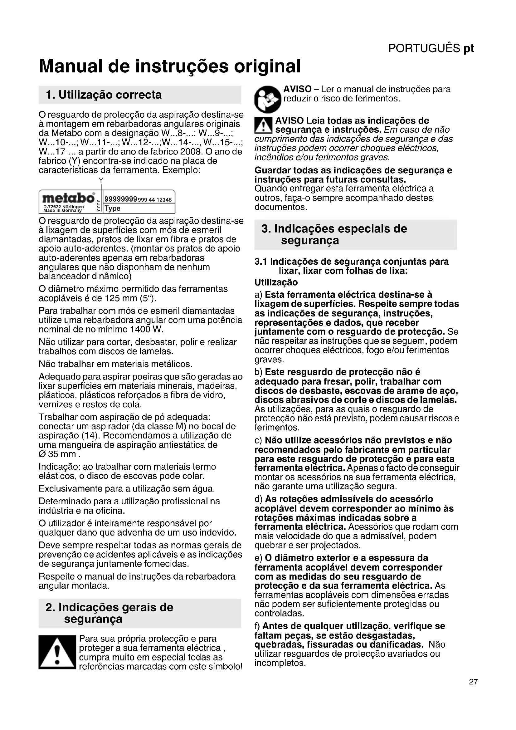 - ; W - a partir do ano de fabrico 2008. O ano de fabrico (Y) encontra-se indicado na placa de características da ferramenta. Exemplo: O resguardo de protecção da aspiração destina-se à lixagem de superfícies com mós de esmeril diamantadas, pratos de lixar em fibra e pratos de apoio auto-aderentes. (montar os pratos de apoio auto-aderentes apenas em rebarbadoras angulares que não disponham de nenhum balanceador dinâmico) O diâmetro máximo permitido das ferramentas acopláveis é de 125 mm (5“). Para trabalhar com mós de esmeril diamantadas utilize uma rebarbadora angular com uma potência nominal de no mínimo 1400 W. Não utilizar para cortar, desbastar, polir e realizar trabalhos com discos de lamelas. Não trabalhar em materiais metálicos. Adequado para aspirar poeiras que são geradas ao lixar superfícies em materiais minerais, madeiras, plásticos, plásticos reforçados a fibra de vidro, vernizes e restos de cola. Trabalhar com aspiração de pó adequada: conectar um aspirador (da classe M) no bocal de aspiração (14). Recomendamos a utilização de uma mangueira de aspiração antiestática de Ø 35 mm . Indicação: ao trabalhar com materiais termo elásticos, o disco de escovas pode colar. Exclusivamente para a utilização sem água. Determinado para a utilização profissional na indústria e na oficina. O utilizador é inteiramente responsável por qualquer dano que advenha de um uso indevido. Deve sempre respeitar todas as normas gerais de prevenção de acidentes aplicáveis e as indicações de segurança juntamente fornecidas. Respeite o manual de instruções da rebarbadora angular montada. Para sua própria protecção e para proteger a sua ferramenta eléctrica , cumpra muito em especial todas as referências marcadas com este símbolo! AVISO – Ler o manual de instruções para reduzir o risco de ferimentos. AVISO Leia todas as indicações de segurança e instruções. Em caso de não cumprimento das indicações de segurança e das instruções podem ocorrer choques eléctricos, incêndios e/ou ferimentos graves. Guardar todas as indicações de segurança e instruções para futuras consultas. Quando entregar esta ferramenta eléctrica a outros, faça-o sempre acompanhado destes documentos. p. 17