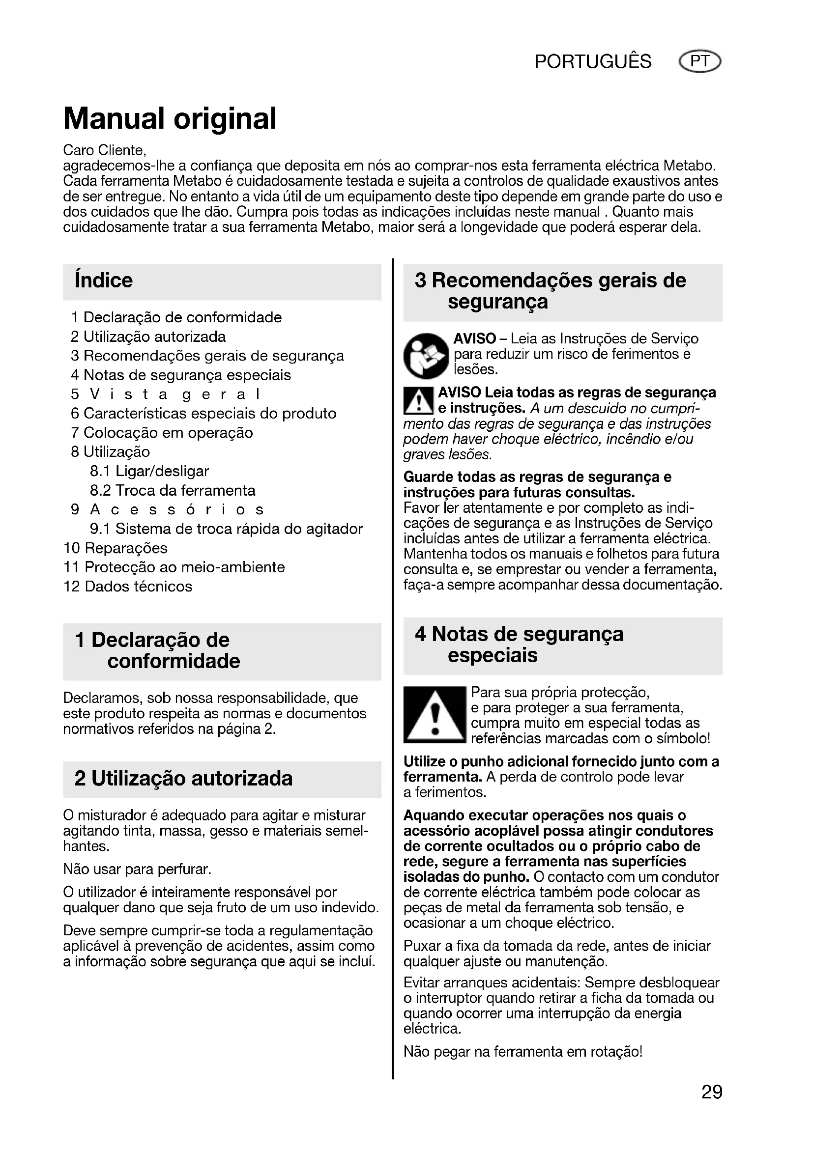 1 Declaração de conformidade 2 Utilização autorizada 3 Recomendações gerais de segurança 4 Notas de segurança especiais 5Vista geral 6 Características especiais do produto 7 Colocação em operação 8 Utilização