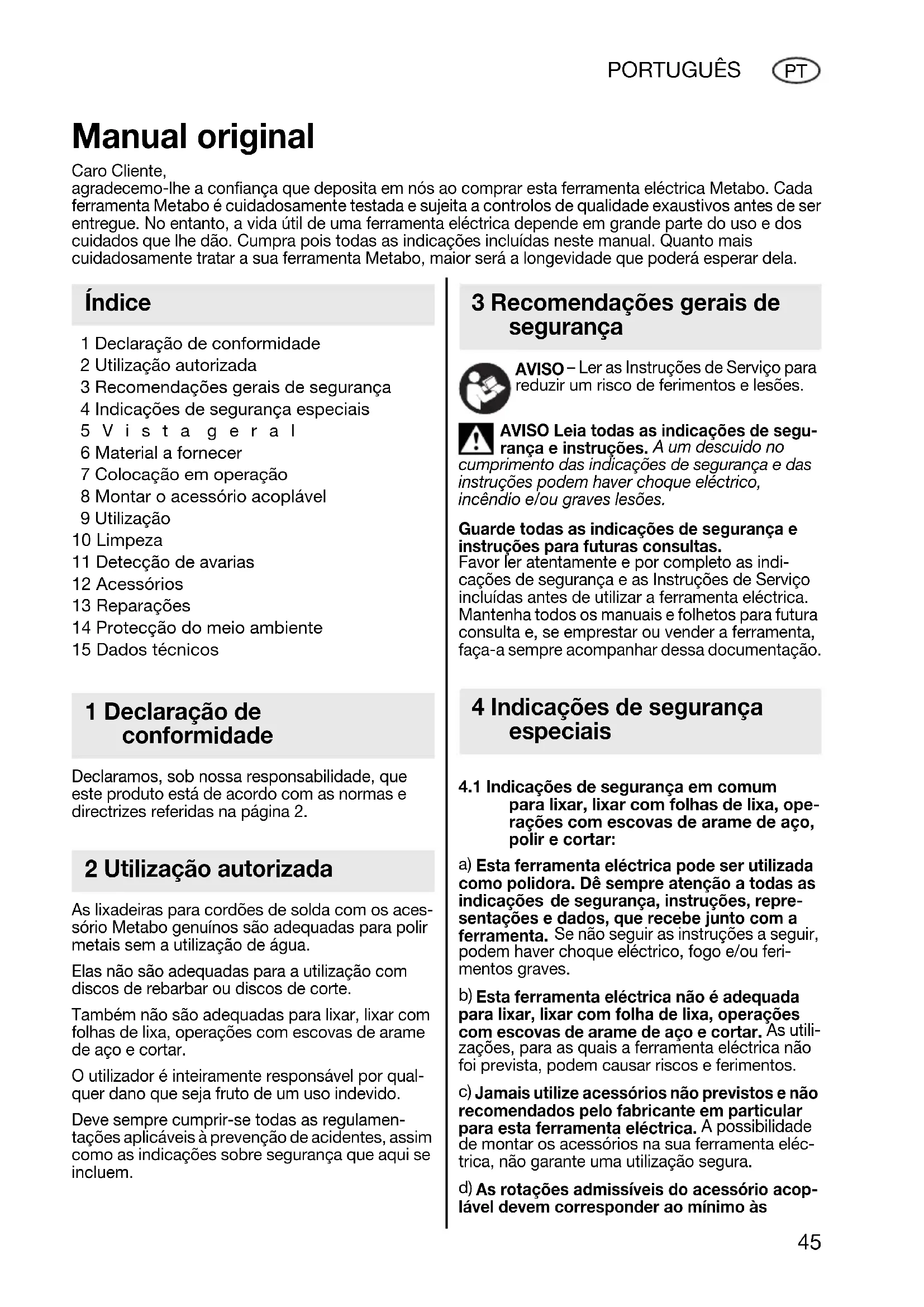 1 Declaração de conformidade 2 Utilização autorizada 3 Recomendações gerais de segurança 4 Indicações de segurança especiais 5Vista geral 6 Material a fornecer 7 Colocação em operação 8 Montar o acessório acoplável 9 Utilização 10 Limpeza 11 Detecção de avarias 12 Acessórios 13 Reparações 14 Protecção do meio ambiente 15 Dados técnicos Declaramos, sob nossa responsabilidade, que este produto está de acordo com as normas e directrizes referidas na página 2. As lixadeiras para cordões de solda com os aces- sório Metabo genuínos são adequadas para polir metais sem a utilização de água. Elas não são adequadas para a utilização com discos de rebarbar ou discos de corte. Também não são adequadas para lixar, lixar com folhas de lixa, operações com escovas de arame de aço e cortar. O utilizador é inteiramente responsável por qual- quer dano que seja fruto de um uso indevido. Deve sempre cumprir-se todas as regulamen- tações aplicáveis à prevenção de acidentes, assim como as indicações sobre segurança que aqui se incluem. AVISO – Ler as Instruções de Serviço para reduzir um risco de ferimentos e lesões. AVISO Leia todas as indicações de segu- rança e instruções. A um descuido no cumprimento das indicações de segurança e das instruções podem haver choque eléctrico, incêndio e/ou graves lesões. Guarde todas as indicações de segurança e instruções para futuras consultas. Favor ler atentamente e por completo as indi- cações de segurança e as Instruções de Serviço incluídas antes de utilizar a ferramenta eléctrica. Mantenha todos os manuais e folhetos para futura consulta e, se emprestar ou vender a ferramenta, faça-a sempre acompanhar dessa documentação.
