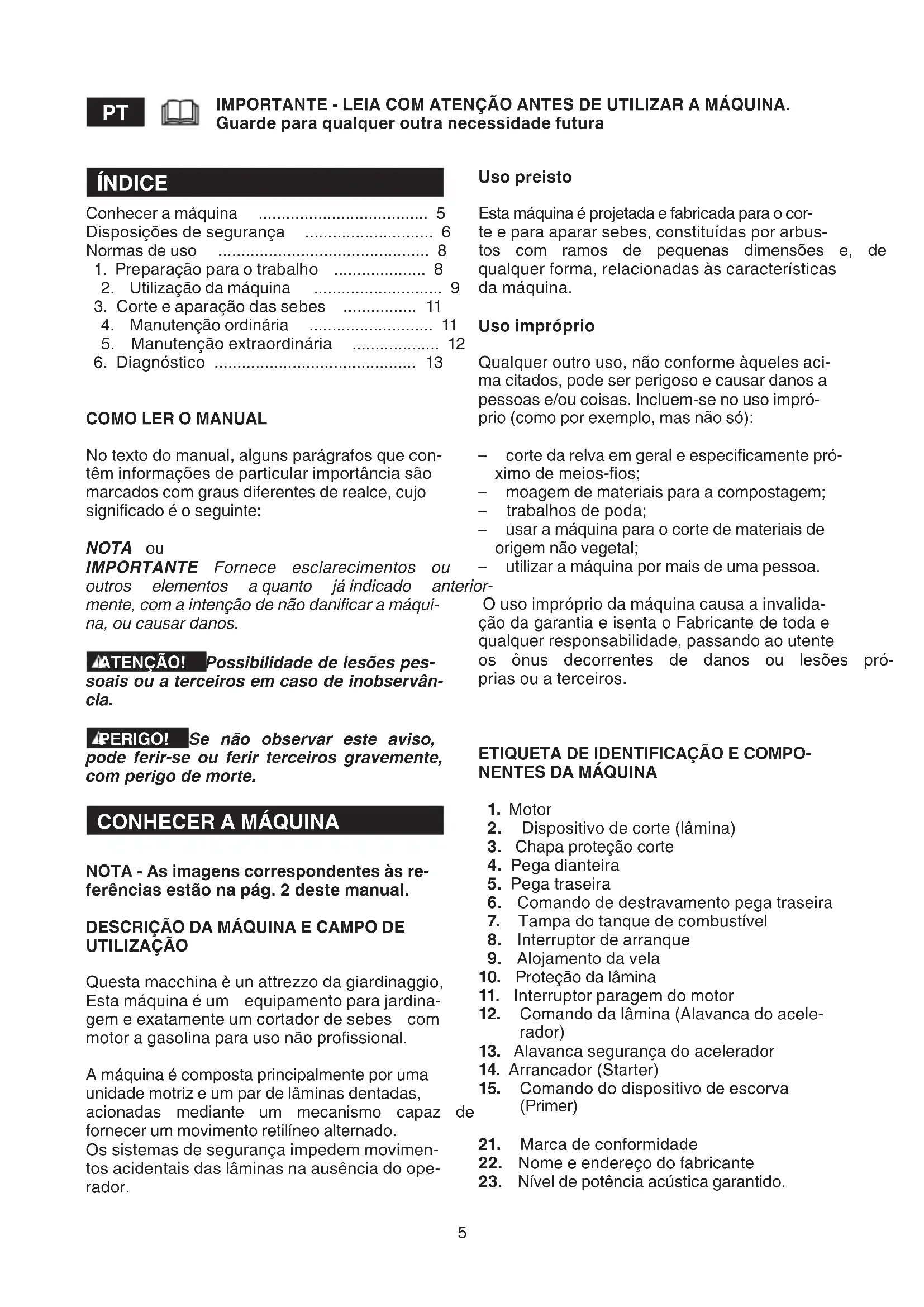 IMPORTANTE - LEIA COM ATENÇÃO ANTES DE UTILIZAR A MÁQUINA. Guarde para qualquer outra necessidade futura Uso preisto Esta máquina é projetada e fabricada para o cor- te e para aparar sebes, constituídas por arbus- tos com ramos de pequenas dimensões e, de qualquer forma, relacionadas às características da máquina. Uso impróprio Qualquer outro uso, não conforme àqueles aci- ma citados, pode ser perigoso e causar danos a pessoas e/ou coisas. Incluem-se no uso impró- prio (como por exemplo, mas não só): – corte da relva em geral e especicamente pró- ximo de meios-os; – moagem de materiais para a compostagem; – trabalhos de poda; – usar a máquina para o corte de materiais de origem não vegetal; – utilizar a máquina por mais de uma pessoa. O uso impróprio da máquina causa a invalida- ção da garantia e isenta o Fabricante de toda e qualquer responsabilidade, passando ao utente os ônus decorrentes de danos ou lesões pró- prias ou a terceiros.