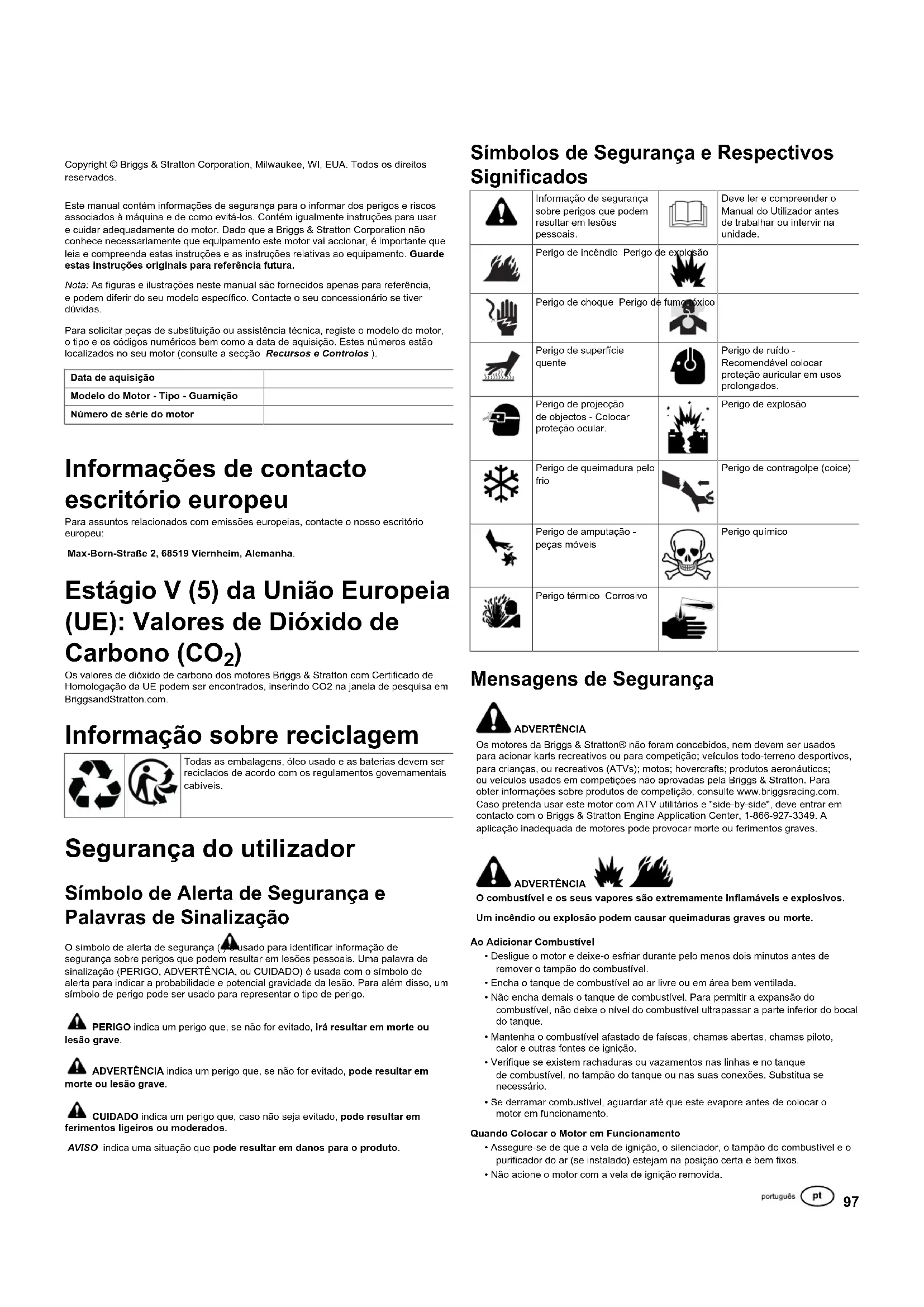 av utstyr, eller feil montering av motoren. Service under garantien er kun tilgjengelig gjennom Briggs & Strattons autoriserte serviceleverandører. Finn nærmeste autoriserte forhandlerverksted på kartet over forhandlere på BRIGGSandSTRATTON.COM, eller ved å ringe 1-800-233-3723 (i USA). 80004537 (Rev. F)97 Copyright © Briggs & Stratton Corporation, Milwaukee, WI, EUA. Todos os direitos reservados. Este manual contém informações de segurança para o informar dos perigos e riscos associados à máquina e de como evitá-los. Contém igualmente instruções para usar e cuidar adequadamente do motor. Dado que a Briggs & Stratton Corporation não conhece necessariamente que equipamento este motor vai accionar, é importante que leia e compreenda estas instruções e as instruções relativas ao equipamento.Guarde estas instruções originais para referência futura. Nota:As figuras e ilustrações neste manual são fornecidos apenas para referência, e podem diferir do seu modelo específico. Contacte o seu concessionário se tiver dúvidas. Para solicitar peças de substituição ou assistência técnica, registe o modelo do motor, o tipo e os códigos numéricos bem como a data de aquisição. Estes números estão localizados no seu motor (consulte a secçãoRecursos e Controlos). Data de aquisição Modelo do Motor - Tipo - Guarnição Número de série do motor Informações de contacto escritório europeu Para assuntos relacionados com emissões europeias, contacte o nosso escritório europeu: Max-Born-Straße 2, 68519 Viernheim, Alemanha. Estágio V (5) da União Europeia (UE): Valores de Dióxido de Carbono (CO