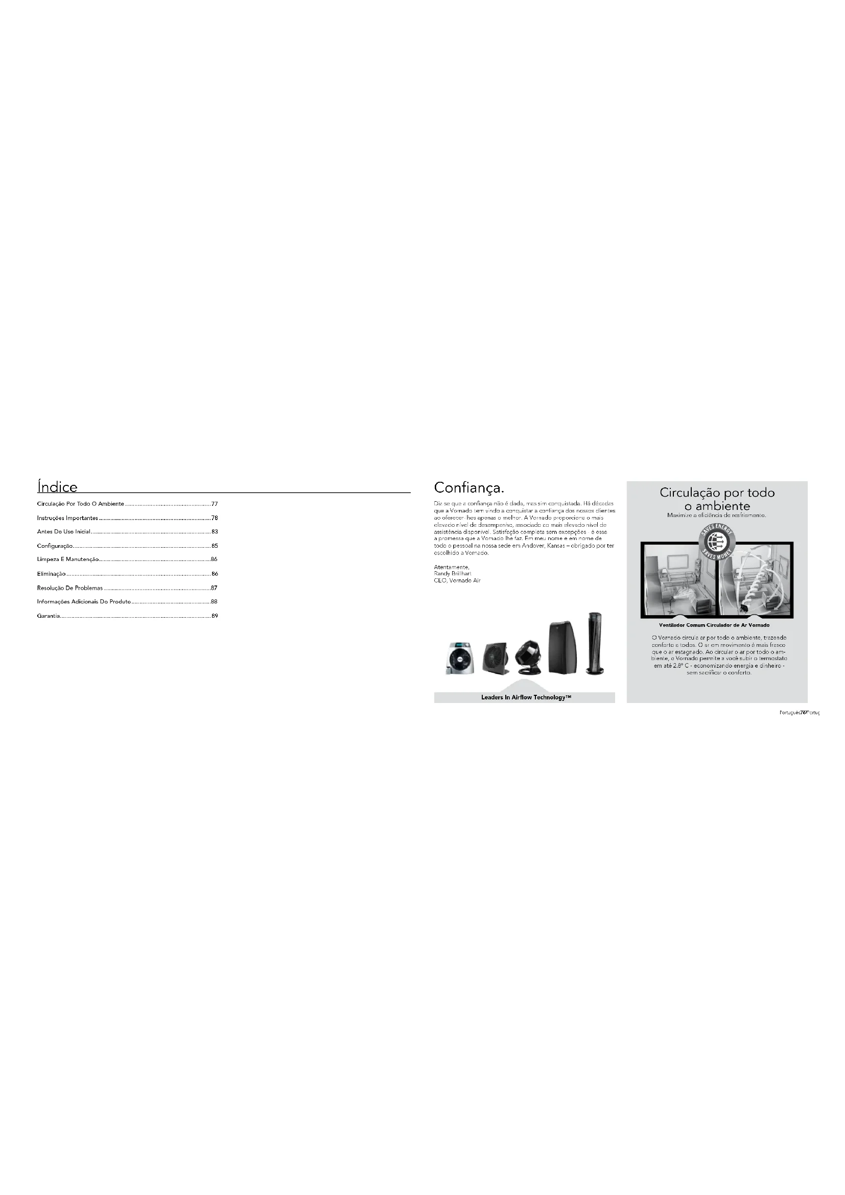 desiderato. È possibile determinare rapidamente l’intensità di ricircolo necessaria per mantenere il livello di comfort desiderato nelle condizioni di temperatura e umidità preval- enti. Una volta sperimentati i vantaggi del ricircolo dell’aria, non sarà più possibile fare a meno del circolatore Vornado. Configuração Quando se deve utilizar - Poupa energia durante todo o ano Verão Utilize o seu circulador de ar com o seu sistema de ar condicionado doméstico para criar um movimento de ar fresco e confortável. Esta brisa irá eliminar ar estagnado e irá remover o calor corporal para o fazer sentir-se mais fresco. Com os circuladores de calor Vornado, pode poupar dinheiro nas contas da electricidade aumentando o seu termóstato em vários graus e mantendo ainda assim o mesmo nível de conforto. Utilizar com ar condicionado central ou de janelaEmpurrar ar frio para cima Primavera e Outono Nas estações mais confortáveis, o seu circulador de ar pode tornar os ambientes de casa mais fresco e agradável como ao ar livre. Coloque a Circulador de Ar próximo de uma janela aberta, porta de correr, ou porta francesa para tirar total vantagem das temperaturas moderadas e brisas das estações. Fazer circular o ar fresco exterior Temperatura ambiente uniforme Inverno Coloque o seu circulador de ar num local com movimento de ar ascendente desobstruído. Ligue-o apenas à velocidade necessária para baixar o ar aquecido do tecto – mas não suficientemente rápida para criar uma cor- rente de ar. Pode também utilizar o seu circulador de ar com outras fontes de calor disponíveis (saídas de ventilação de lareiras, fogões a lenha ou aquece- dores de rodapé) para fazer circular o seu calor, aproveitando ao máximo todo o calor disponível na divisão. Não oriente o circulador de ar na direcção de chamas abertas. Aumentar a eficiência de fontes de aquecimentoSubstituir ar frio ao nível do solo por ar quente ao nível do tecto Onde utilizar Divisões ideais para o circulador de ar Cozinha, quarto mais pequeno, quarto de dormitório, cubículo no escritório Estúdio, escritório em casa, quarto com lareira, sala de jantar, quarto de dormir normal Sala de estar, quarto principal, , quarto de brincar, oficina/ sala de tempos livres, sala com muita luz Modelo Série 500 VFAN e Série 600 Série 660 e 70087 Português86 Português O motor está permanentemente lubrificado, pelo que não necessita de lubrificação. Para limpar a cobertura do motor e as pás ventiladoras: Utilize um aspirador doméstico normal. Não utilize água para limpar estas peças do circulador de ar. Para limpar a base: limpe com um pano húmido. Limpeza e Manutenção Porque seu produto se move uma quantidade substancial de ar, ele vai precisar de uma limpeza regular para remover fiapos, poeira e su- jeira. Nunca limpe o produto de qualquer maneira além de instruído no manual do proprietário deste. AVISO Observe as seguintes informações de segurança para evitar ris- cos e dano à propriedade. Desligue o seu circulador antes de realizar a sua limpeza. Não utilize gasolina, diluentes, solventes, amoníacos ou outros químicos para realizar a limpeza. Não tente reparar ou substituir peças. NOTAS IMPORTANTES RECICLAGEM DA EMBALAGEM: A embalagem protege o aparelho do dano no transporte. Os materiais de embalagem são selecionados do ponto de vista do seu uso ambiental e tecnologia de descarte e são, portanto, recicláveis. Descarte todos os materiais da embalagem de uma forma ambien- talmente responsável. IMPORTANT NOTES Reciclagem WEEE Descarte de equipamentos elétricos e eletrônicos: Esta marca indica que este produto não deve ser descartado junto com outros resíduos domésticos na União Europeia. Para evitar possíveis danos ao meio ambiente ou à saúde humana decorrentes do descarte de resíduos não controlado, recicle-o de forma responsável, a fim de promover o uso sustentável de recursos materiais. Para devolver seu dispositivo usado, favor usar os sistemas de coleta e devolução ou entrar em contato com a loja onde o produto foi adquirido. A loja irá encaminhar o produto para reciclagem ambiental segura. Eliminação Consulte a página final para o seu Centro de Serviço Autorizado. O aparelho não está ligado à tomada. Ligue o aparelho a uma tomada elétrica. Verifique se a velocidade do ventilador está selecionada. O aparelho está danificado ou precisa de reparo. Desligue o aparelho e tire-o da tomada. Entre em contato com o Serviço de Atendimento ao Cliente para obter assistência. A tomada está desgastada ou danificada. Tente usar outra tomada ou entre em contato com um eletricista qualificado. O aparelho está configurado para uma velocidade baixa. Ajuste-o para uma velocidade mais alta. O fluxo de ar está bloqueado. Remova a obstrução. Ajuste a direção do fluxo de ar em direção ao usuário. Sob certas condições, é possível uma reinicialização da tomada GFCI (Interruptor de Circuito por Falha de Aterramento) para viajar quando o usuário está trocando as velocidades em um circulador Vornado. Neste caso, troque para uma tomada que não esteja conectada a um dispositivo GFCI. Ele também poderia indicar uma to- mada GFCI fraca ou defeituosa. Entre em contato com um eletricista qualificado para verificar a tomada GFCI. L'apparecchio non si accende. Il flusso d'aria è debole o lento. GFCI foi disparado. Problema Causa Possível e Solução Resolução De Problemas89 Português88 Português Modelo(s): 530-E 533-EU 573-EU 630-E 633-EU 660 683-EU733/735-EU2783-EU2 VFAN-EU Descrição Símbolo Unidade Valor Valor Valor Valor Valor Valor Valor Valor Valor Valor Tensão de Entrada V 220 - 240 220 - 240 220 - 240 220 - 240 220 - 240 220 - 240
