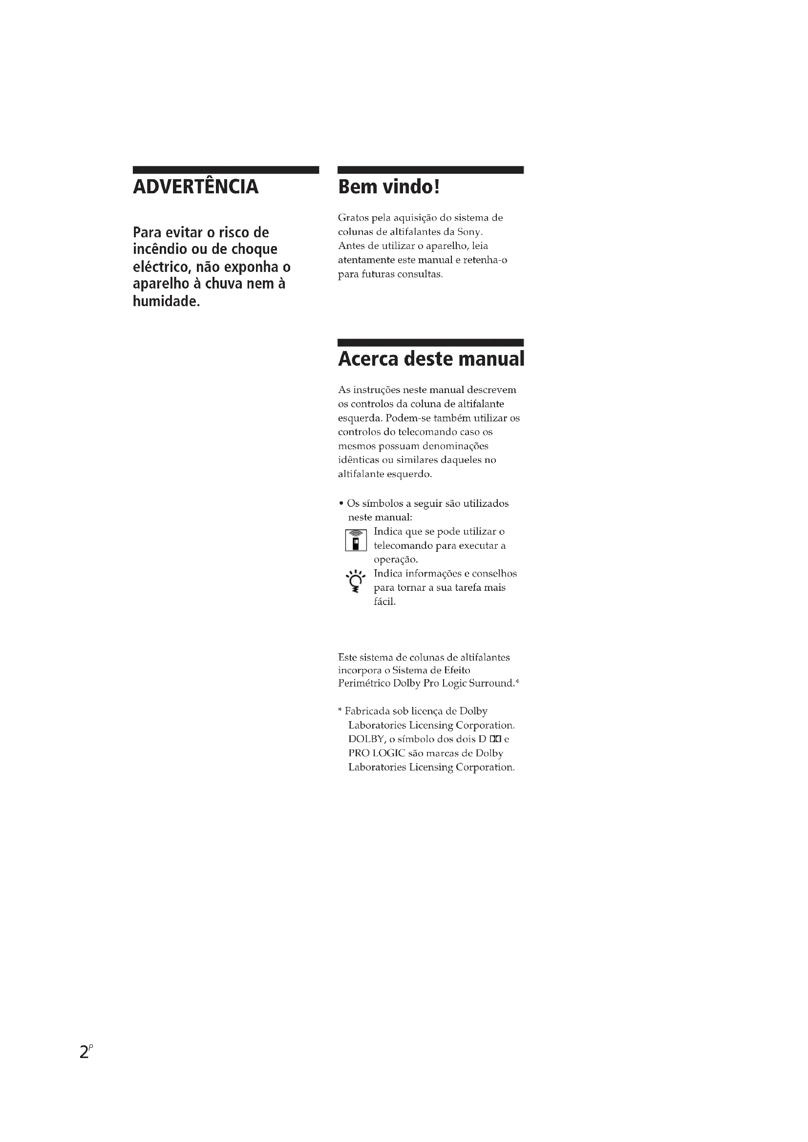 - Os símbolos a seguir são utilizados neste manual: Indica que se pode utilizar o telecomando para executar a operação. Indica informações e conselhos para tornar a sua tarefa mais fácil. Este sistema de colunas de altifalantes incorpora o Sistema de Efeito Perimétrico Dolby Pro Logic Surround.*