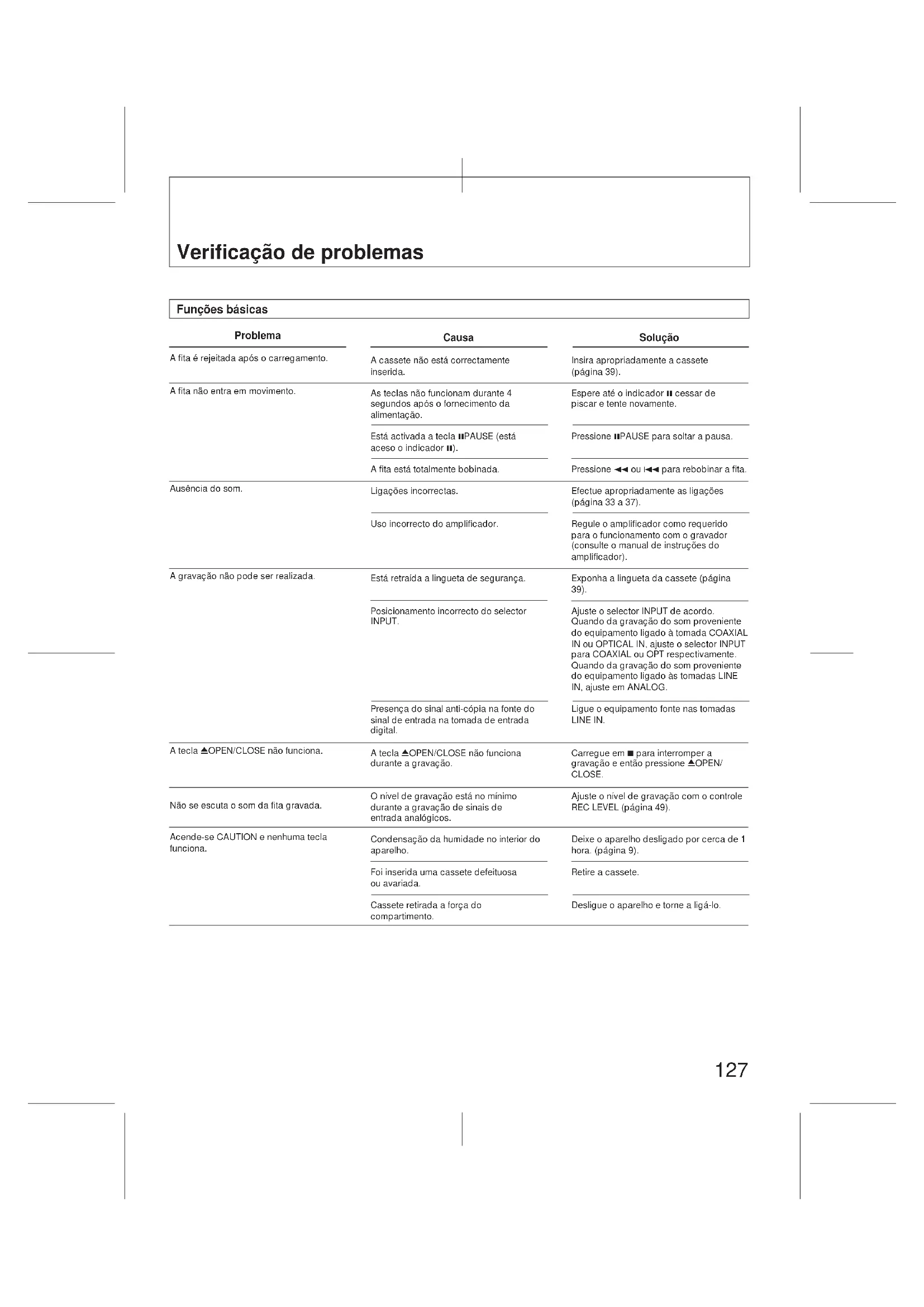 Síntoma El transporte de la cinta es demasiado ruidoso en el modo de rebobinado o de avance rápido. La cinta se para repentinamente. Volumen desequilibrado entre los canales derecho e izquierdo. Aumento del ruido y deterioro de la calidad del sonido. Después de haber presionado 1 / ¡ o 4 / ¢, la cinta se parará durante un momento, y después volverá a ponerse en funcionamiento. Solución de problemas127 Solução Insira apropriadamente a cassete (página 39). Espere até o indicador 8 cessar de piscar e tente novamente. Pressione 8PAUSE para soltar a pausa. Pressione 1 ou 4 para rebobinar a fita. Efectue apropriadamente as ligações (página 33 a 37). Regule o amplificador como requerido para o funcionamento com o gravador (consulte o manual de instruções do amplificador). Exponha a lingueta da cassete (página 39). Ajuste o selector INPUT de acordo. Quando da gravação do som proveniente do equipamento ligado à tomada COAXIAL IN ou OPTICAL IN, ajuste o selector INPUT para COAXIAL ou OPT respectivamente. Quando da gravação do som proveniente do equipamento ligado às tomadas LINE IN, ajuste em ANALOG. Ligue o equipamento fonte nas tomadas LINE IN. Carregue em 7 para interromper a gravação e então pressione 0OPEN/ CLOSE. Ajuste o nível de gravação com o controle REC LEVEL (página 49). Deixe o aparelho desligado por cerca de 1 hora. (página 9). Retire a cassete. Desligue o aparelho e torne a ligá-lo. Causa A cassete não está correctamente inserida. As teclas não funcionam durante 4 segundos após o fornecimento da alimentação. Está activada a tecla 8PAUSE (está aceso o indicador 8). A fita está totalmente bobinada. Ligações incorrectas. Uso incorrecto do amplificador. Está retraída a lingueta de segurança. Posicionamento incorrecto do selector INPUT. Presença do sinal anti-cópia na fonte do sinal de entrada na tomada de entrada digital. A tecla 0OPEN/CLOSE não funciona durante a gravação. O nível de gravação está no mínimo durante a gravação de sinais de entrada analógicos. Condensação da humidade no interior do aparelho. Foi inserida uma cassete defeituosa ou avariada. Cassete retirada a força do compartimento. Problema A fita é rejeitada após o carregamento. A fita não entra em movimento. Ausência do som. A gravação não pode ser realizada. A tecla 0OPEN/CLOSE não funciona. Não se escuta o som da fita gravada. Acende-se CAUTION e nenhuma tecla funciona. Funções básicas Verificação de problemas128 Solução Insira uma cassete com a lingueta de segurança na posição que possilita gravações (página 39). Deixe no mínimo de 9 segundos (18 segundos no modo de leitura prolongada) a partir do fim do ID de início anterior. Apague-o (página 69) e inscreva-o novamente. Quando da inscrição manual dos IDs de início, assegure-se de deixar intervalos de mais de 9 segundos (18 segundos no modo de leitura prolongada). Empregue RENUMBER para re- enumerar as músicas (página 75). Desligue-o com SKIP PLAY. Desligue-o com REPEAT 1 ALL. Empregue a função de salto ao ponto de término (página 55) antes de gravar para não deixar nenhum espaço em branco. Realize as operações após a inscrição do ID de início. Rebobine a fita ao início, ou localize o último trecho da gravação anterior com a função de salto ao ponto de término (página 55), e então inicie a gravação Coloque o aparelho no modo de gravação em pausa com ¶REC e então inscreva o ID de término. Quando da inscrição manual dos IDs de início, assegure-se de deixar intervalos de mais de 9 segundos (18 segundos no modo de leitura prolongada). Quando da inscrição do ID de saltos, assegure-se de deixar intervalos de mais de 1 segundo (2 segundos no modo de leitura prolongada). Inicie a gravação a partir do início da fita. Apague primeiro o ID de início. Funções com os sub-códigos Problema Sub-códigos não podem ser inscritos. O ID de início não pode ser gravado durante a gravação A função de busca não pode ser activada durante a leitura. A função de busca entra automaticamente em funcionamento durante a leitura. É interrompida a função de busca. As teclas de operação não funcionam durante a inscrição do ID de início Os códigos de tempo absoluto não podem ser inscritos. O ID de término não pode ser inscrito durante a leitura. Não funciona a função de re- enumeração. O ID de início não pode ser apagado. Não se pode apagar o ID de saltos. Não se pode apagar o ID de término. Causa Insira uma cassete com a lingueta de segurança na posição que impossilita gravações. Um novo ID de início não pode ser inscrito a 9 segundos (18 segundos no modo de leitura prolongada) do fim de um outro ID de início. O ID de início não foi inscrito correctamente. O trecho entre o fim de um ID de início e o início do próximo ID de início é inferior a 9 segundos (18 segundos no modo de leitura prolongada). Não existe o número da música seleccionada. Os números das músicas estão fora de ordem. Está em funcionamento a função de saltos. (Acende-se o indicador SKIP no visor). Está em funcionamento a função de repetição da leitura. Há um trecho em branco entre as músicas (pisca o indicador da frequência de amostragem no visor). Durante a inscrição do ID de início (9 segundos ou 18 segundos) funciona somente a tecla 7. A gravação foi iniciada a partir de um trecho com espaço em branco. O trecho onde deseja inscrever o ID de término está em branco. O trecho entre o fim de um ID de início e o início do próximo ID de início é inferior a 9 segundos (18 segundos no modo de leitura prolongada). Dois IDs de saltos foram inscritos um atrás do outro. O ID de término foi inscrito no início da fita. O ID de término foi inscrito imediatamente após um ID de início. Verificação de problemas129 Outros Causa Isto depende da cassete utilizada e não representa um problema. Foi inserida uma cassete defeituosa ou ava