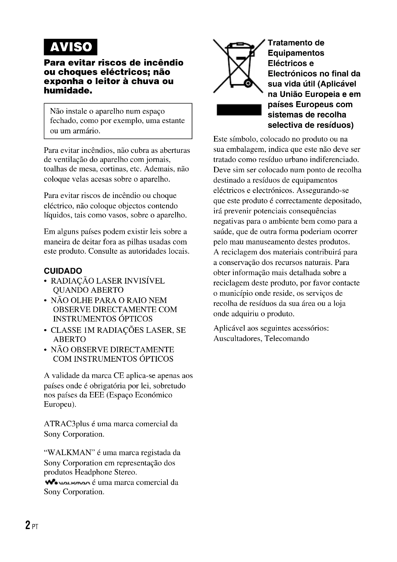 Vista de lista 17 Información adicional D-NE720/NE720LS.ES.2-541-637-22(1) 37 ESAVISO Para evitar riscos de incêndio ou choques eléctricos; não exponha o leitor à chuva ou humidade. Não instale o aparelho num espaço fechado, como por exemplo, uma estante ou um armário. Para evitar incêndios, não cubra as aberturas de ventilação do aparelho com jornais, toalhas de mesa, cortinas, etc. Ademais, não coloque velas acesas sobre o aparelho. Para evitar riscos de incêndio ou choque eléctrico, não coloque objectos contendo líquidos, tais como vasos, sobre o aparelho. Em alguns países podem existir leis sobre a maneira de deitar fora as pilhas usadas com este produto. Consulte as autoridades locais. CUIDADO