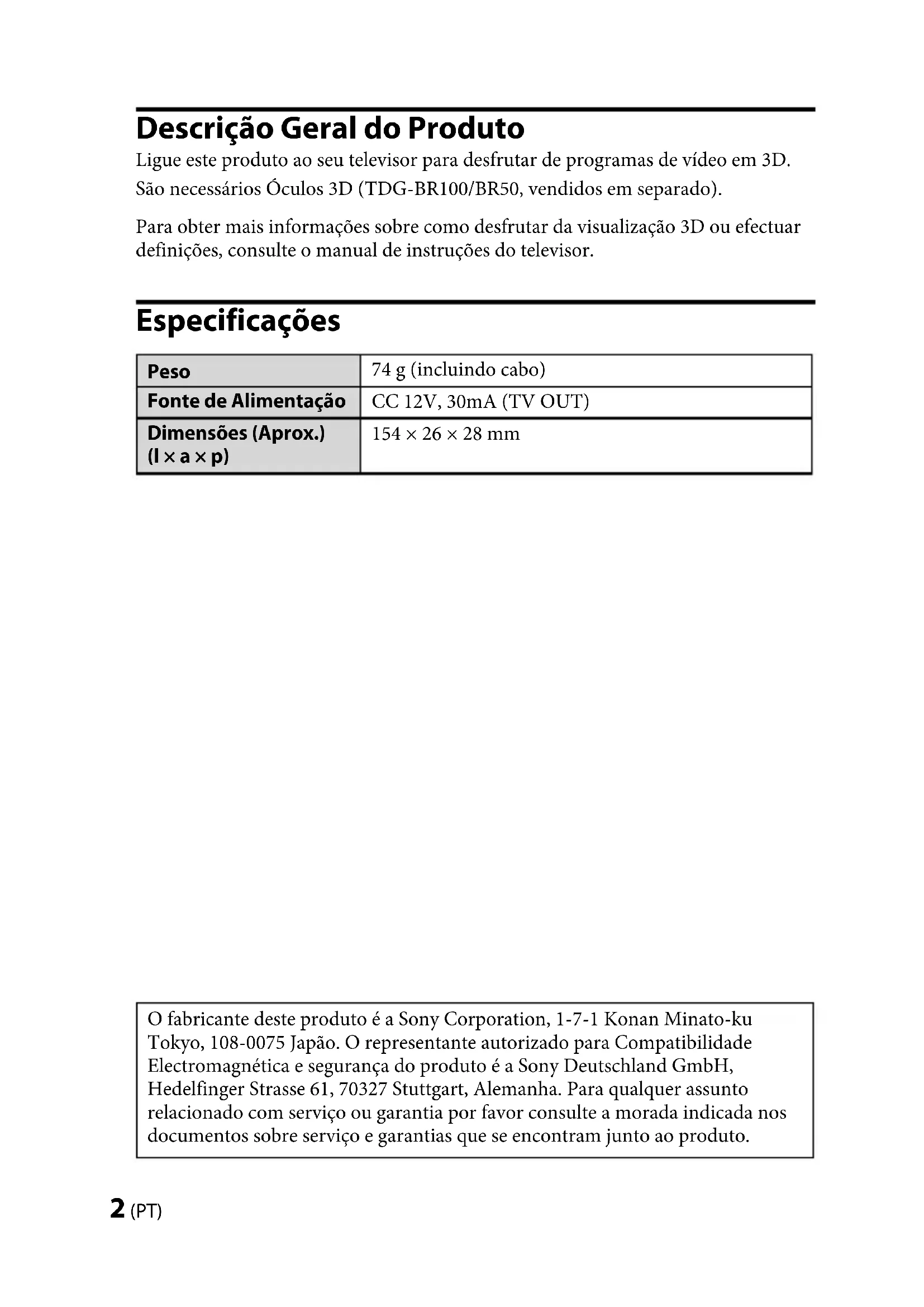Cabo de Sincronização 3D Ligue ao terminal de 3D SYNC do televisor. Configurar o Transmissor de Sincronização 3D Não aproxime o Transmissor de Sincronização 3D do sensor do telecomando . (Continuação)TMR-BR100 4-180-471-26(1) 6 (PT) TMR-BR100 4-180-471-26(1) 120˚ Quando o televisor está colocado num armário ou mesa: Posicione o Transmissor de Sincronização 3D ao centro do televisor, ao longo da extremidade dianteira do suporte de fixação para mesas ou suporte do televisor. 120˚ Se o televisor for montado numa parede, coloque o Transmissor de Sincronização 3D no televisor (parte central superior ou parte superior direita - do - centro), utilizando fita de face dupla. Ajuste o ângulo do Transmissor de Sincronização 3D com base na ilustração. +10˚ –10˚ 120˚ 120˚ 120˚TMR-BR100 4-180-471-26(1) TMR-BR100 4-180-471-26(1) 7 (PT) Alcance de Comunicação do Transmissor de Sincronização 3D e dos Óculos 3D Coloque o Transmissor de Sincronização 3D em frente ao televisor e certifique- se de que não existem obstáculos entre o Transmissor de Sincronização 3D e os Óculos 3D. 120˚ 1 m ~ 6 m típico 1 m ~ 6 m típico 120˚ Vista superior Vista lateral Ligações Desligue o televisor e ligue o Transmissor de Sincronização 3D ao terminal 3D SYNC do televisor. Ligue o televisor e verifique se aparecem os itens do menu 3D na lista do menu OPTIONS. Certifique-se de que desliga o televisor, assim que for possível este reconhecer o Transmissor de Sincronização 3D. Consulte o manual de instruções do televisor para obter mais informações sobre como desfrutar da visualização 3D. Resolução de problemas Em caso de problema, consulte o manual de instruções do televisor.TMR-BR100 4-180-471-26(1) 2 (DK) TMR-BR100 4-180-471-26(1) Produktoversigt Dette produkt skal sluttes til tv’et, før du kan opleve videoprogrammer i 3D. 3D-briller (TDG-BR100/BR50, sælges separat) er også nødvendige. Yderligere oplysninger om 3D-visning og angivelse af indstillinger findes i betjeningsvejledningen til tv'et. Specifikationer Vægt 74 g (inklusive kabel) Strømforsyning 12 V DC, 30mA (TV OUT) Mål (ca.) (b × h × d) 154 × 26 × 28 mm Producenten af dette produkt er Sony Corporation, 1-7-1 Konan Minato- ku Tokyo, 108-0075 Japan. Den autoriserede repræsentant for EMC og produktsikkerhed er Sony Deutschland GmbH, Hedelfinger Strasse 61, 70327 Stuttgart, Germany. For service eller garanti henviser vi til de adresser, som fremgår af vedlagte garantidokument.TMR-BR100 4-180-471-26(1) TMR-BR100 4-180-471-26(1) 3 (DK)