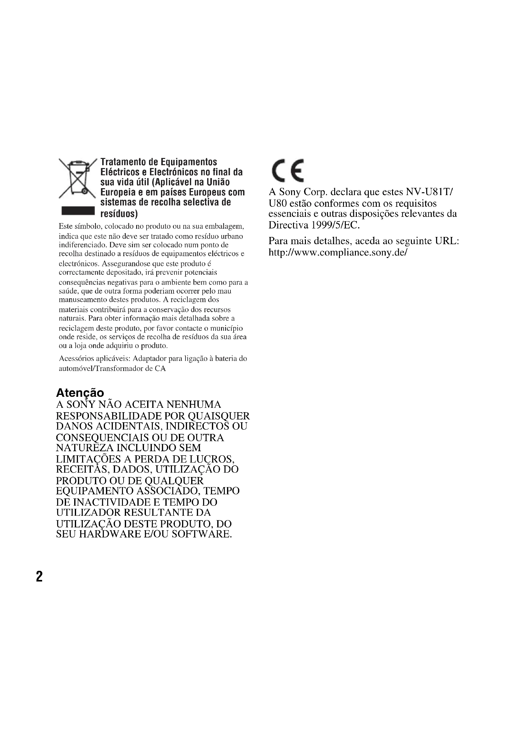 SEU HARDWARE E/OU SOFTWARE. A Sony Corp. declara que estes NV-U81T/ U80 estão conformes com os requisitos essenciais e outras disposições relevantes da Directiva 1999/5/EC. Para mais detalhes, aceda ao seguinte URL: http://www.compliance.sony.de/ Tratamento de Equipamentos Eléctricos e Electrónicos no final da sua vida útil (Aplicável na União Europeia e em países Europeus com sistemas de recolha selectiva de resíduos) Este símbolo, colocado no produto ou na sua embalagem, indica que este não deve ser tratado como resíduo urbano indiferenciado. Deve sim ser colocado num ponto de recolha destinado a resíduos de equipamentos eléctricos e electrónicos. Assegurandose que este produto é correctamente depositado, irá prevenir potenciais consequências negativas para o ambiente bem como para a saúde, que de outra forma poderiam ocorrer pelo mau manuseamento destes produtos. A reciclagem dos materiais contribuirá para a conservação dos recursos naturais. Para obter informação mais detalhada sobre a reciclagem deste produto, por favor contacte o município onde reside, os serviços de recolha de resíduos da sua área ou a loja onde adquiriu o produto. Acessórios aplicáveis: Adaptador para ligação à bateria do automóvel/Transformador de CAÍndice