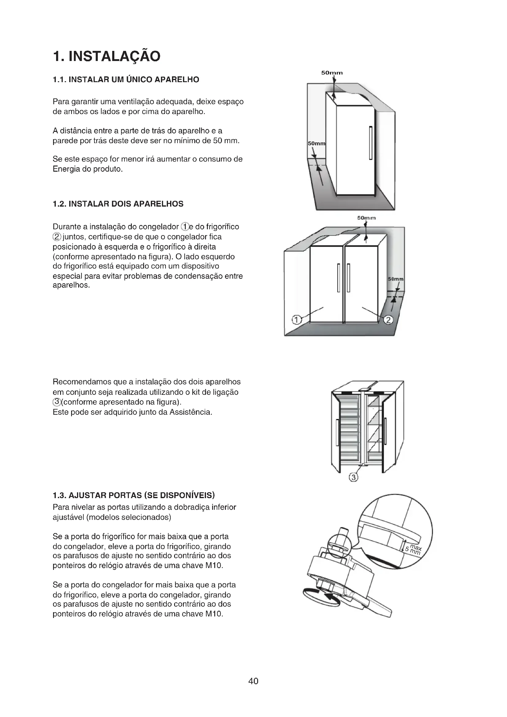 (conformeapresentadonafigura). EstepodeseradquiridojuntodaAssistência. 1.3. AJUSTAR PORTAS (SE DISPONÍVEIS) Para nivelar as portas utilizando a dobradiça inferior ajustável (modelos selecionados) Se a porta do frigorífico for mais baixa que a porta do congelador, eleve a porta do frigorífico, girando os parafusos de ajuste no sentido contrário ao dos ponteirosdorelógioatravésdeumachaveM10. Se a porta do congelador for mais baixa que a porta do frigorífico, eleve a porta do congelador, girando os parafusos de ajuste no sentido contrário ao dos ponteirosdorelógioatravésdeumachaveM10. 50mm 50mm 5 mm max41