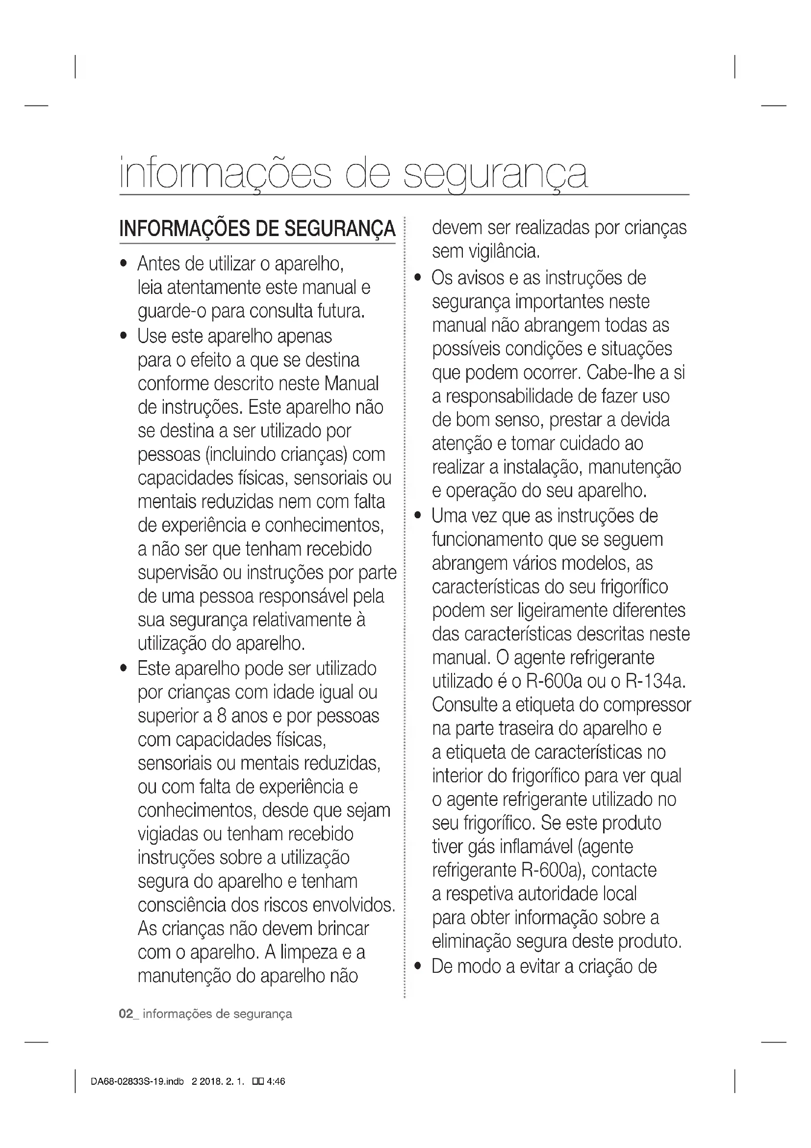 - De modo a evitar a criação de informações de segurança DA68-02833S-19.indb 2 2018. 2. 1. 4:46informações de segurança _03 uma mistura de gás e ar inflamável no caso de ocorrer uma fuga no circuito de refrigeração, a dimensão da divisão na qual se pode colocar o aparelho depende da quantidade de agente refrigerante utilizado.