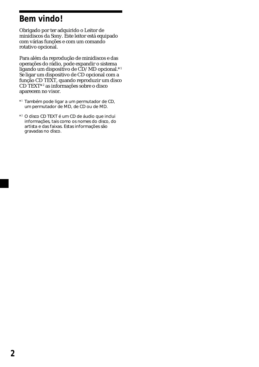 Bem vindo! Obrigado por ter adquirido o Leitor de minidiscos da Sony. Este leitor está equipado com várias funções e com um comando rotativo opcional. Para além da reprodução de minidiscos e das operações do rádio, pode expandir o sistema ligando um dispositivo de CD/MD opcional.*1 Se ligar um dispositivo de CD opcional com a função CD TEXT, quando reproduzir um disco CD TEXT*2 as informações sobre o disco aparecem no visor. *1 Também pode ligar a um permutador de CD, um permutador de MD, de CD ou de MD. *2 O disco CD TEXT é um CD de áudio que inclui informações, tais como os nomes do disco, do artista e das faixas. Estas informações são gravadas no disco.