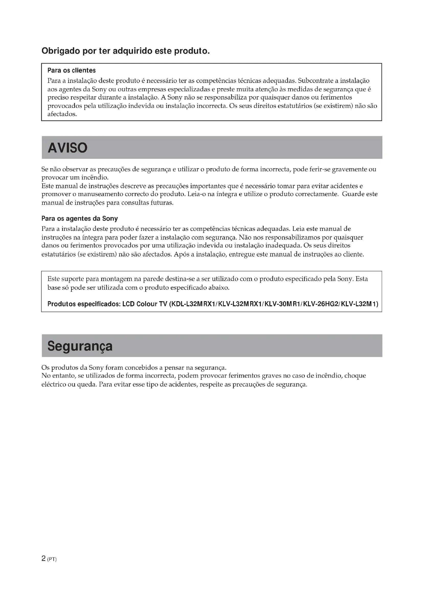 2452 (PT) Obrigado por ter adquirido este produto. Para os clientes Para a instalação deste produto é necessário ter as competências técnicas adequadas. Subcontrate a instalação aos agentes da Sony ou outras empresas especializadas e preste muita atenção às medidas de segurança que é preciso respeitar durante a instalação. A Sony não se responsabiliza por quaisquer danos ou ferimentos provocados pela utilização indevida ou instalação incorrecta. Os seus direitos estatutários (se existirem) não são afectados. AVISO Se não observar as precauções de segurança e utilizar o produto de forma incorrecta, pode ferir-se gravemente ou provocar um incêndio. Este manual de instruções descreve as precauções importantes que é necessário tomar para evitar acidentes e promover o manuseamento correcto do produto. Leia-o na íntegra e utilize o produto correctamente. Guarde este manual de instruções para consultas futuras. Para os agentes da Sony Para a instalação deste produto é necessário ter as competências técnicas adequadas. Leia este manual de instruções na íntegra para poder fazer a instalação com segurança. Não nos responsabilizamos por quaisquer danos ou ferimentos provocados por uma utilização indevida ou instalação inadequada. Os seus direitos estatutários (se existirem) não são afectados. Após a instalação, entregue este manual de instruções ao cliente. Este suporte para montagem na parede destina-se a ser utilizado com o produto especificado pela Sony. Esta base só pode ser utilizada com o produto especificado abaixo. Produtos especificados: LCD Colour TV (KDL-L32MRX1/KLV-L32MRX1/KLV-30MR1/KLV-26HG2/KLV-L32M1) Segurança Os produtos da Sony foram concebidos a pensar na segurança. No entanto, se utilizados de forma incorrecta, podem provocar ferimentos graves no caso de incêndio, choque eléctrico ou queda. Para evitar esse tipo de acidentes, respeite as precauções de segurança.3 (PT) Português