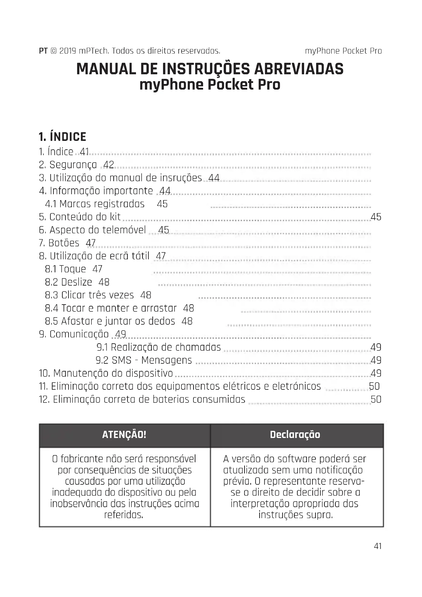 ATENÇÃO! Declaração O fabricante não será responsável por consequências de situações causadas por uma utilização inadequada do dispositivo ou pela inobservância das instruções acima referidas. A versão do software poderá ser atualizada sem uma notificação prévia. O representante reserva- se o direito de decidir sobre a interpretação apropriada das instruções supra.PT © 2019 mPTech. Todos os direitos reservados.