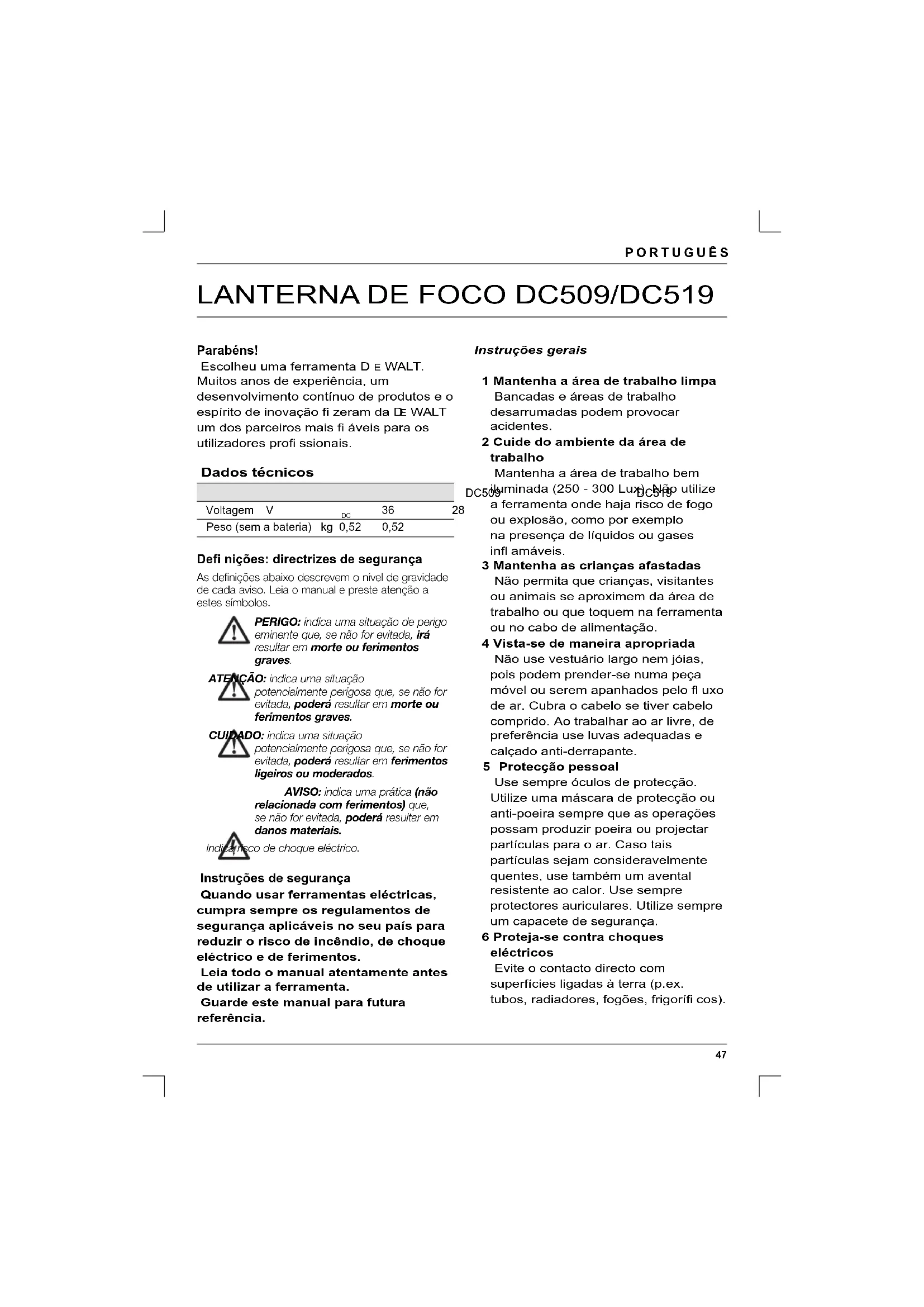 - Antes de utilizar a ferramenta, dedique o tempo necessário à leitura e compreensão deste manual. Descrição (fi g. A) ATENÇÃO: nunca modifi que a lanterna de foco nem qualquer um dos seus componentes. Tal poderia resultar em danos ou ferimentos. FINALIDADE As lanternas de foco DC509/DC519 para utilização intensiva foram concebidas para funcionar com baterias de 36 V ou 28 V e podem ser utilizadas como modelo autónomo ou como modelo fi xo. NÃO utilize a ferramenta em condições de humidade nem na presença de líquidos ou gases infl amáveis. NÃO permita que crianças mexam na ferramenta. É necessária supervisão quando operadores sem experiência utilizarem esta ferramenta. 1 Interruptor on/off 2 Base 3 Tubo fl exível 4 Cabeça 5 Lente 6 Suporte da lente 7 Bateria (não incluído) Segurança eléctrica Verifi que sempre se a tensão da bateria corresponde à indicada na placa de características. Certifi que-se de que a voltagem do seu carregador corresponde à da rede eléctrica.