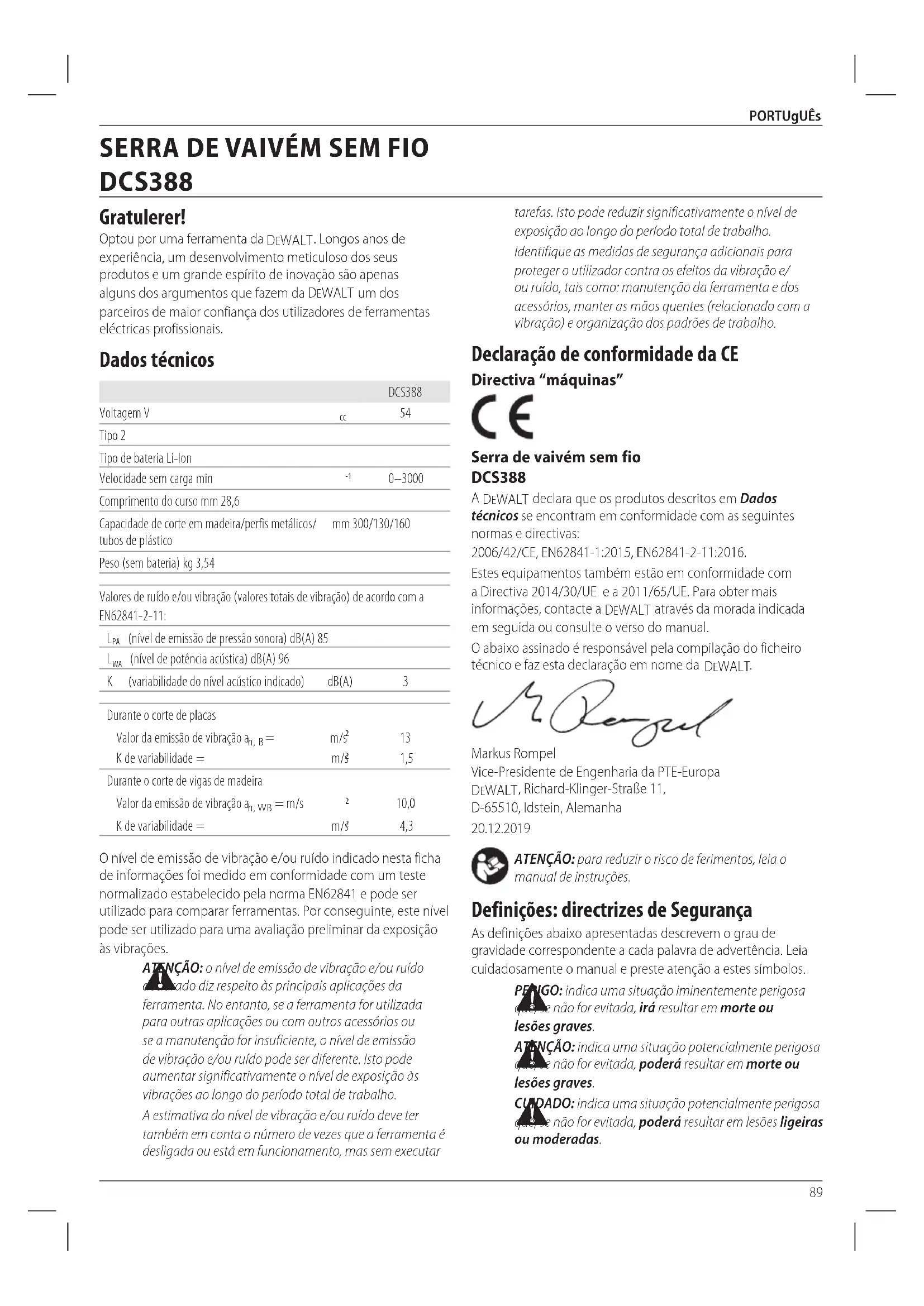 CUIDADO: indica uma situação potencialmente perigosa que, se não for evitada, poderá resultar em lesões ligeiras oumoderadas. Declaração de conformidade da CE Directiva “máquinas” Serra de vaivém sem fio DCS388