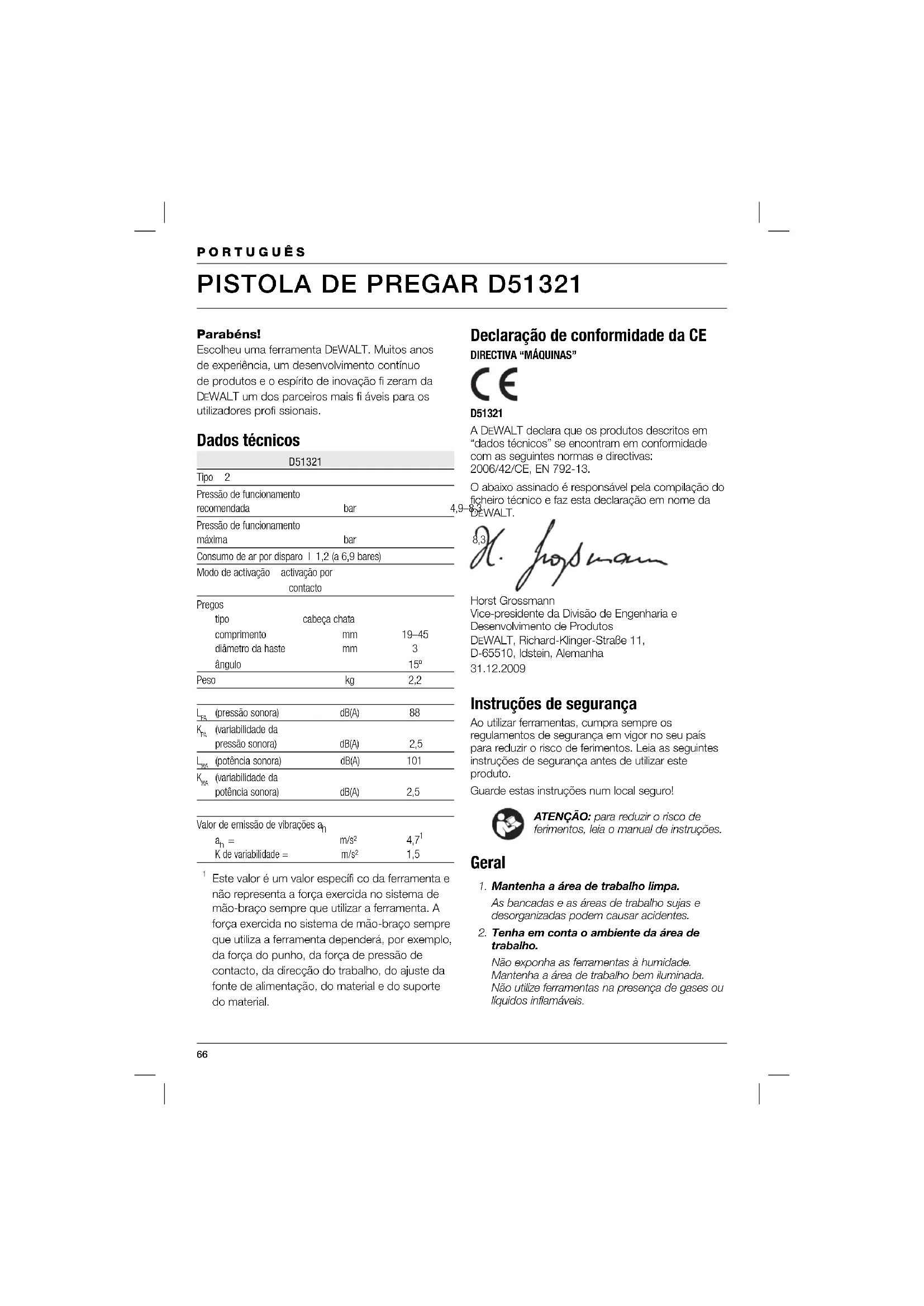 D51321 A DEWALT declara que os produtos descritos em “dados técnicos” se encontram em conformidade com as seguintes normas e directivas: 2006/42/CE, EN 792-13. O abaixo assinado é responsável pela compilação do ficheiro técnico e faz esta declaração em nome da DEWALT. Horst Grossmann Vice-presidente da Divisão de Engenharia e Desenvolvimento de Produtos DEWALT, Richard-Klinger-Straße 11, D-65510, Idstein, Alemanha