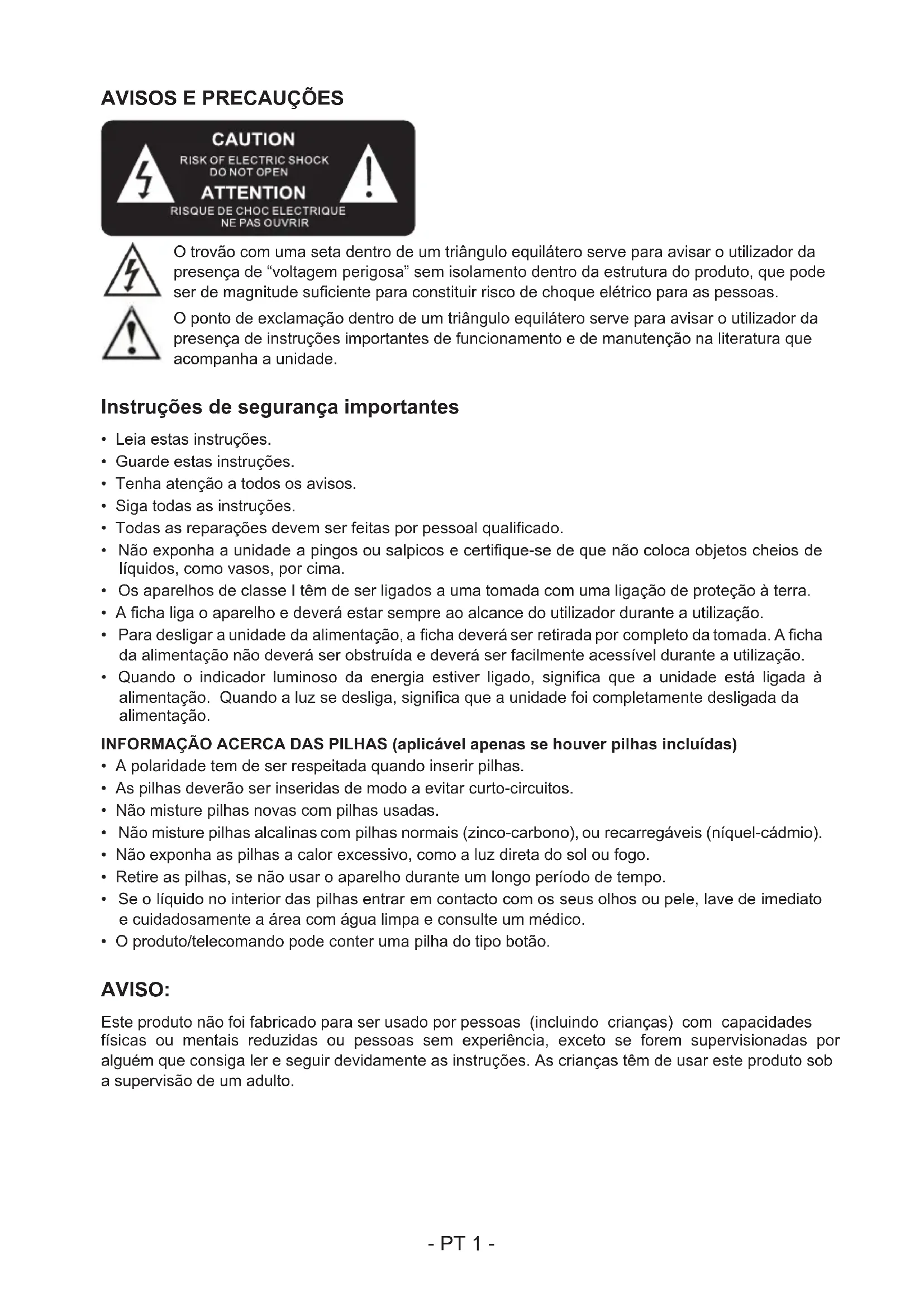 - O produto/telecomando pode conter uma pilha do tipo botão. AVISO: Este produto não foi fabricado para ser usado por pessoas (incluindo crianças) com capacidades físicas ou mentais reduzidas ou pessoas sem experiência, exceto se forem supervisionadas por alguém que consiga ler e seguir devidamente as instruções. As crianças têm de usar este produto sob a supervisão de um adulto.- PT 2 - AVISO RELATIVO ÀS PILHAS: Não engula as pilhas. Existe o risco de queimaduras químicas. Este produto contém uma ou várias pilhas. Se uma pilha for engolida, pode causar lesões internas severas ou morte em menos de 2 horas. Mantenha as pilhas novas e usadas afastadas das crianças e de pessoas vulneráveis. Se o compartimento das pilhas não puder ser fechado corretamente, deixe de usar o produto. Se uma pilha for engolida, consulte imediatamente um médico. OBSERVAÇÕES IMPORTANTES: Existe o risco de explosão se as pilhas não forem substituídas corretamente, ou se o produto não for usado durante um longo período de tempo com as pilhas no interior. Substitua as pilhas antigas por umas idênticas. duplo isolamento corrente direta corrente alternada Símbolo de utilização no interior Cuidados com o ambiente O seu produto foi criado e fabricado com materiais e componentes de alta qualidade, que podem ser reciclados e reutilizados. O seu produto contém pilhas abrangidas pela Diretiva Europeia 2006/66/CE que não podem ser eliminadas juntamente com o lixo doméstico comum. Informe-se acerca das normas locais relativas à recolha em separado de pilhas, pois uma eliminação correta ajuda a prevenir consequências negativas para o ambiente e para a saúde humana. Quando este símbolo de um caixote do lixo com uma cruz vier no produto, signica que o produto é abrangido pela Diretiva Europeia 2002/96/CE. Por favor, informe-se acerca do sistema de recolha em separado para produtos elétricos e eletrónicos. Aja de acordo com as regras locais e não elimine o seu produto antigo juntamente com o lixo doméstico comum. A eliminação correta do seu velho produto ajuda a prevenir potenciais consequências negativas para o ambiente e para a saúde humana.- PT 3 - Conformidade Este produto encontra-se em conformidade com os requisitos das interferências de rádio da União Europeia. Alimentação a pilhas: Certique-se de que as pilhas são inseridas corretamente, para evitar danos no aparelho. Retire sempre as pilhas quando o aparelho não for utilizado durante um longo período de tempo, pois isso causa derrames nas pilhas e acaba por danicar o aparelho. Use pilhas do mesmo tipo. Nunca misture diferentes tipos de pilhas. Não atire as pilhas para o fogo, nem as exponha à luz direta do sol ou algo parecido. Se o líquido no interior das pilhas entrar em contacto com os seus olhos ou pele, então lave de imediato a área cuidadosamente com água limpa e consulte um médico. CUIDADO