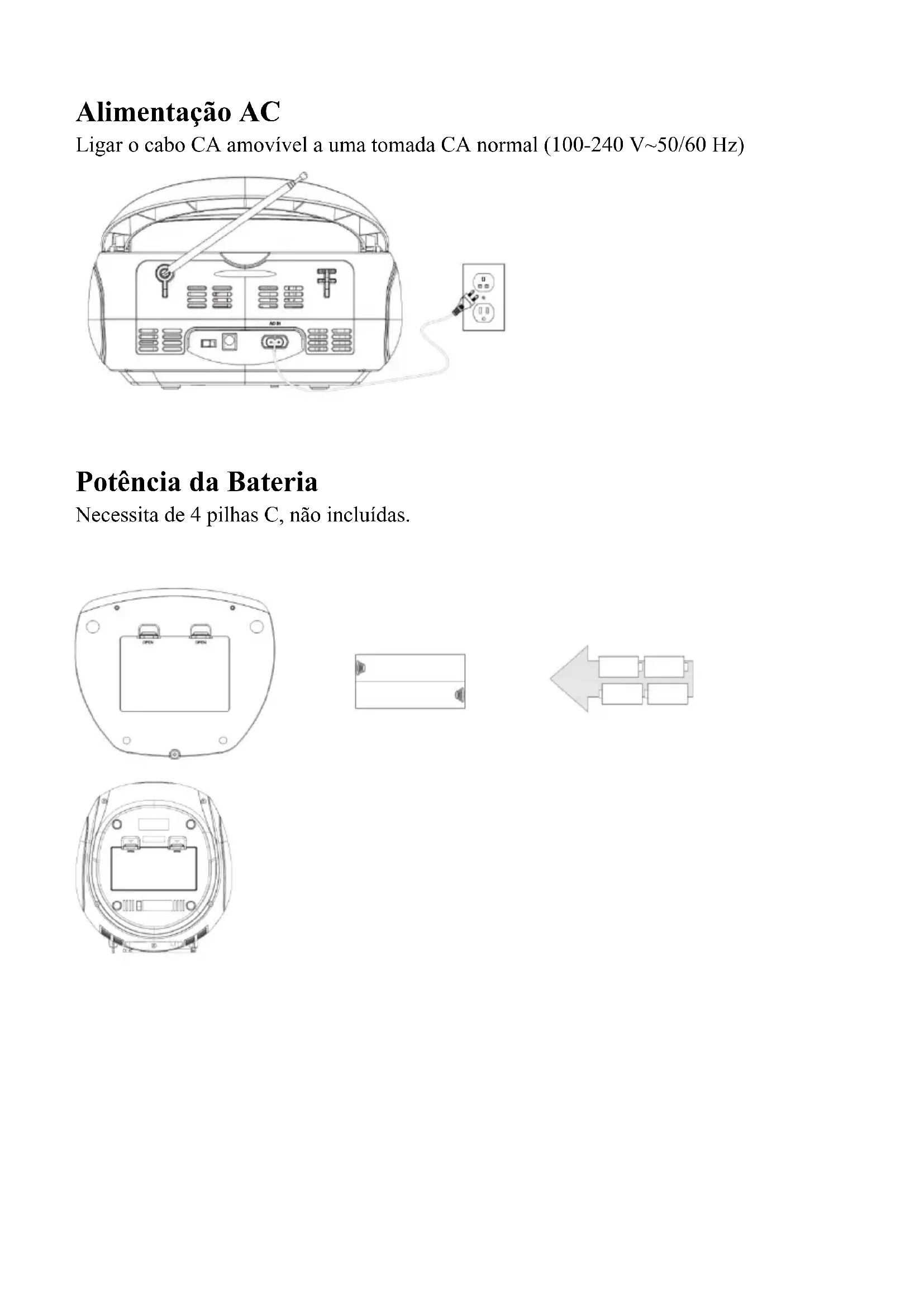 Potência da Bateria Necessita de 4 pilhas C, não incluídas.Ouvir o Rádio FM 1.Ajuste a função para o modo de FM premindo o botão FUN. Estique a antena FM para melhorar a receção de rádio FM. 2.Efetue uma pressão breve no botão ANT ou SEG para sintonizar a estação anterior ou seguinte disponível. 3.Efetue uma pressão demorada no botão ANT ou SEG para procurar automaticamente a estação de rádio anterior ou seguinte. 4.Efetue uma pressão demorada no botão REPRODUZIR/PAUSA para procurar automaticamente e guardar estações de rádio. Podem ser guardadas até 30 estações de rádio. Rádio DAB 1.Ajuste a função para o modo de DAB premindo o botão FUN. 2.Efetue uma pressão demorada no botão REPRODUZIR/PAUSA para procurar automaticamente e guardar estações de rádio DAB. 3.Efetue uma pressão breve no botão ANT/SEG para destacar uma estação secundária e prima o botão ENTER para selecionar. 4.Efetue uma pressão breve no botão INFO para apresentar os detalhes da estação.
