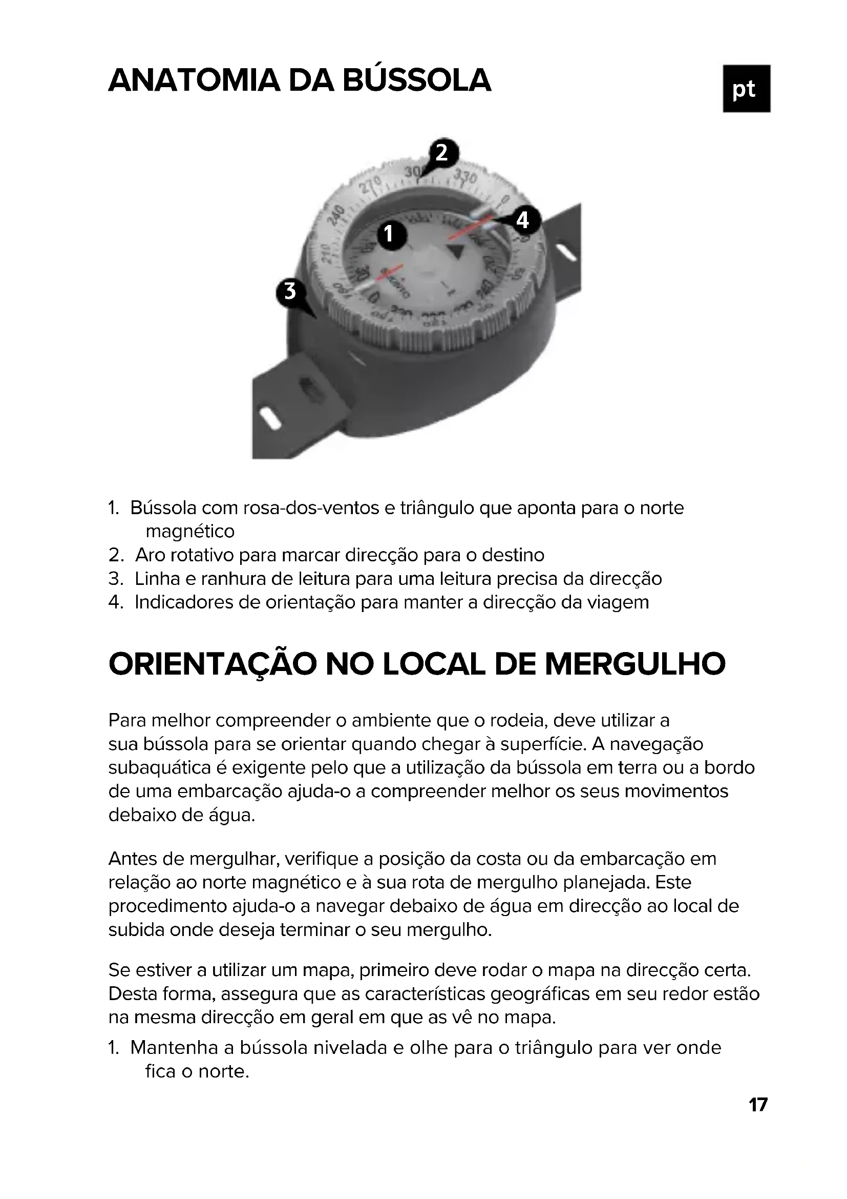 com o triângulo. Nade em direcção ao destino e verifique a sua direcção quando o mesmo não for visível segurando a bússola como no passo 2 acima. Se os indicadores de orientação e o triângulo não estiverem alinhados, rode19 sobre o seu corpo até que fiquem alinhados e desloque-se na direcção corrigida. Não utilize a bússola antes de repousar e de poder alinhá-la horizontalmente com a ajuda de um fundo plano, uma visualização da superfície, as suas próprias bolhas ao subir ou a força da gravidade. Em condições de pouca luz ou em água muito turva, deslize a bússola lentamente da direita para a esquerda para garantir que a rosa-dos-ventos se movimenta livremente antes de verificar a direcção.