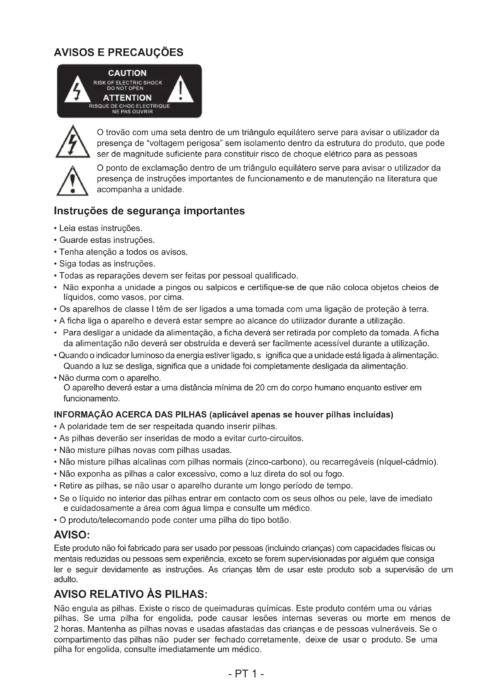 - O produto/telecomando pode conter uma pilha do tipo botão. AVISO: Este produto não foi fabricado para ser usado por pessoas (incluindo crianças) com capacidades físicas ou mentais reduzidas ou pessoas sem experiência, exceto se forem supervisionadas por alguém que consiga ler e seguir devidamente as instruções. As crianças têm de usar este produto sob a supervisão de um adulto. AVISO RELATIVO ÀS PILHAS: Não engula as pilhas. Existe o risco de queimaduras químicas. Este produto contém uma ou várias pilhas. Se uma pilha for engolida, pode causar lesões internas severas ou morte em menos de 2 horas. Mantenha as pilhas novas e usadas afastadas das crianças e de pessoas vulneráveis. Se o compartimento das pilhas não puder ser fechado corretamente, deixe de usar o produto. Se uma pilha for engolida, consulte imediatamente um médico. - PT 1 -- PT 2 - OBSERVAÇÕES IMPORTANTES: Existe o risco de explosão se as pilhas não forem substituídas corretamente, ou se o produto não for usado durante um longo período de tempo com as pilhas no interior. Substitua as pilhas antigas por umas idênticas. duplo isolamento corrente direta corrente alternada Símbolo de utilização no interior Cuidados com o ambiente O seu produto foi criado e fabricado com materiais e componentes de alta qualidade, que podem ser reciclados e reutilizados. Quando este símbolo de um caixote do lixo com uma cruz vier no produto, significa que o produto é abrangido pela Diretiva Europeia 2002/96/CE. Por favor, informe-se acerca do sistema de recolha em separado para produtos elétricos e eletrónicos. Aja de acordo com as regras locais e não elimine o seu produto antigo juntamente com o lixo doméstico comum. A eliminação correta do seu velho produto ajuda a prevenir potenciais consequências negativas para o ambiente e para a saúde humana. Conformidade Este produto encontra-se em conformidade com os requisitos das interferências de rádio da União Europeia. Este aparelho inclui esta etiqueta. Alimentação a pilhas