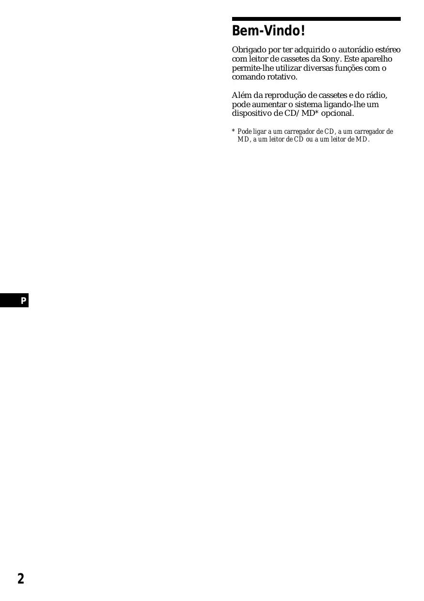 Bem-Vindo! Obrigado por ter adquirido o autorádio estéreo com leitor de cassetes da Sony. Este aparelho permite-lhe utilizar diversas funções com o comando rotativo. Além da reprodução de cassetes e do rádio, pode aumentar o sistema ligando-lhe um dispositivo de CD/MD* opcional. * Pode ligar a um carregador de CD, a um carregador de MD, a um leitor de CD ou a um leitor de MD.