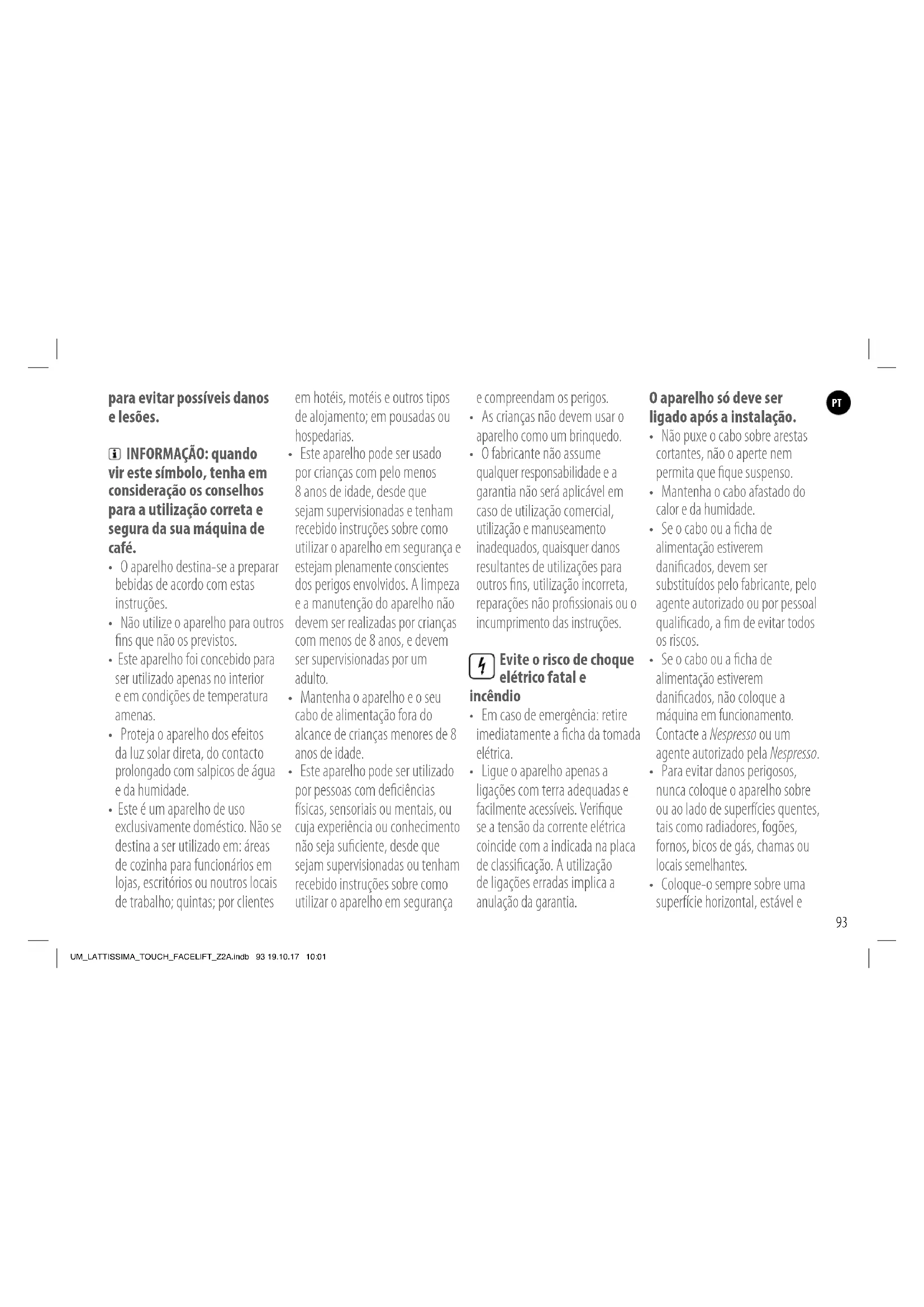 UM_LATTISSIMA_TOUCH_FACELIFT_Z2A.indb 92 19.10.17 10:01PT para evitar possíveis danos e lesões. INFORMAÇÃO: quando vir este símbolo, tenha em consideração os conselhos para a utilização correta e segura da sua máquina de café.