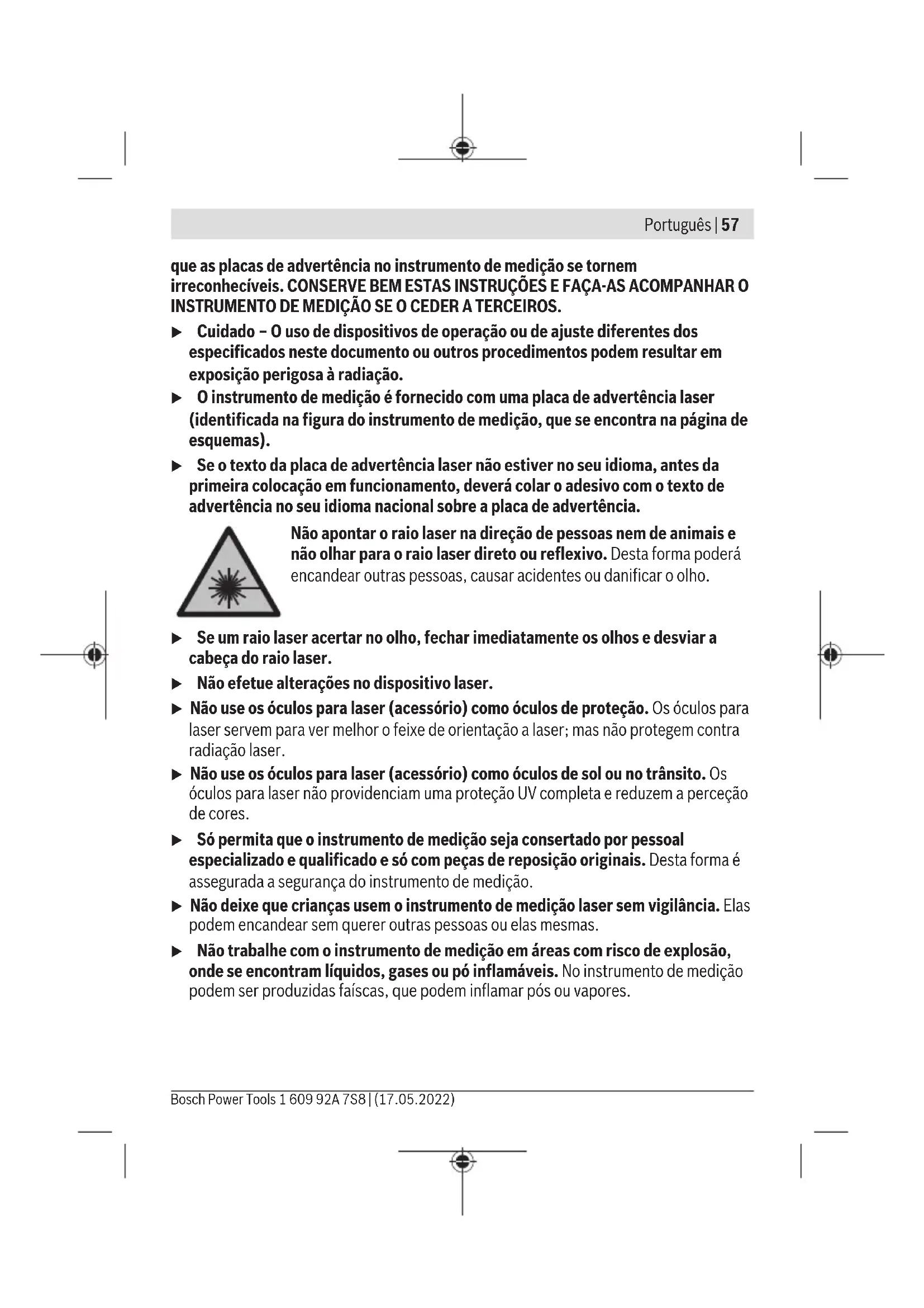 180° – Rode o instrumento de medição em 180°. Posicione-o de forma a que o centro do ponto laser inferior se encontre no pontoⅡ já marcado. Deixe o instrumento de medição executar a nivelação. Marque o centro do ponto laser superior (pontoⅢ). – Da diferença d dos dois pontos marcados Ⅰ e Ⅲ no teto resulta o desvio real do instrumento de medição do plano vertical. O desvio máximo permitido é calculado da seguinte maneira: distância dupla entre chão e teto ×0,35mm/m. Bosch Power Tools 1 609 92A 7S8 | (17.05.2022)66 | Português Exemplo: numa distância entre chão e teto de 2,5m o desvio máximo pode ser 2×2,5m×±0,35mm/m=±1,75mm. Os pontos Ⅰ e Ⅲ podem encontrar-se separados no máximo 1,75mm entre si. Instruções de trabalho u Use sempre o centro do ponto laser para as marcações. O tamanho do ponto do raio laser modifica-se com a distância. Trabalhar com um tripé (acessório) Um tripé assegura uma base de medição estável e ajustável em altura. Coloque o instrumento de medição com o suporte de tripé der 1/4" (4) na rosca do tripé (11) ou num tripé de máquina fotográfica convencional. Fixe o instrumento de medição com o parafuso de fixação do tripé. Alinhar aproximadamente o tripé antes de ligar o instrumento de medição. Fixe com o suporte rotativo magnético (verfigurasA−B) Com o suporte rotativo magnético integrado(3) pode fixar o instrumento de medição em materiais magnetizáveis. u Mantenha os dedos afastados da parte de trás do suporte rotativo magnético, quando fixa o suporte magnético a superfícies. Devido à forte força de tração dos ímanes(7) os dedos podem ficar entalados. Alinhe aproximadamente o suporte rotativo magnético(3) antes de ligar o instrumento de medição. Rode o instrumento de medição no suporte rotativo magnético(3) para tornar visível o ponto laser inferior ou para transmitir alturas com o ponto laser horizontal. Deixe o instrumento de medição engatar novamente no suporte rotativo quando o desligar e transportar (verfiguraB). Óculos de visualização de raio laser (acessórios) Os óculos de visualização de raio laser filtram a luz ambiente. Com isto a luz do laser parece mais clara para os olhos. u Não use os óculos para laser (acessório) como óculos de proteção. Os óculos para laser servem para ver melhor o feixe de orientação a laser; mas não protegem contra radiação laser. u Não use os óculos para laser (acessório) como óculos de sol ou no trânsito. Os óculos para laser não providenciam uma proteção UV completa e reduzem a perceção de cores. 1 609 92A 7S8 | (17.05.2022) Bosch Power ToolsPortuguês | 67 Exemplos de trabalho (ver figura C–E) Pode ver exemplos para possibilidades de utilização do instrumento de medição nas páginas gráficas. Manutenção e assistência técnica Manutenção e limpeza Manter o instrumento de medição sempre limpo. Não mergulhar o instrumento de medição na água ou em outros líquidos. Limpar sujidades com um pano húmido e macio. Não utilize detergentes ou solventes. Limpe particularmente as áreas na abertura de saída do laser com regularidade e certifique-se de que não existem fiapos. Armazene e transporte o instrumento de medição apenas na bolsa de proteção (12). Envie o instrumento de medição em caso de reparação na bolsa de proteção (12). Serviço pós-venda e aconselhamento O serviço pós-venda responde às suas perguntas a respeito de serviços de reparação e de manutenção do seu produto, assim como das peças sobressalentes. Desenhos explodidos e informações acerca das peças sobressalentes também em: www.bosch- pt.com A nossa equipa de consultores Bosch esclarece com prazer todas as suas dúvidas a respeito dos nossos produtos e acessórios. Indique para todas as questões e encomendas de peças sobressalentes a referência de 10 dígitos de acordo com a placa de caraterísticas do produto. Brasil Robert Bosch Ltda. – Divisão de Ferramentas Elétricas Rodovia Anhanguera, Km 98 - Parque Via Norte 13065-900, CP 1195 Campinas, São Paulo Tel.: 0800 7045 446 www.bosch.com.br/contato Portugal Robert Bosch LDA Avenida Infante D. Henrique Lotes 2E – 3E 1800 Lisboa Bosch Power Tools 1 609 92A 7S8 | (17.05.2022)68 | Italiano Para efetuar o seu pedido online de peças entre na página www.ferramentasbosch.com. Tel.: 21 8500000 Fax: 21 8511096 Encontra outros endereços da assistência técnica em: www.bosch-pt.com/serviceaddresses Eliminação Os instrumentos de medição, acessórios e embalagens devem ser enviados a uma reciclagem ecológica de matéria-prima. Não deite o instrumento de medição e as pilhas no lixo doméstico! Apenas para países da UE: Conforme a Diretiva Europeia 2012/19/UE relativa aos resíduos de equipamentos elétricos e eletrónicos e a sua implementação na legislação nacional, é necessário recolher separadamente os instrumentos de medição que já não são usados e, de acordo com a Diretiva Europeia 2006/66/CE, as baterias/pilhas defeituosas e encaminhá-los para uma reciclagem ecológica. No caso de uma eliminação incorreta, os aparelhos elétricos e eletrónicos antigos podem ter efeitos nocivos no ambiente e na saúda humada devido à possível presença de substâncias perigosas. Italiano Avvertenze di sicurezza Leggere e osservare tutte le avvertenze e le istruzioni, per lavo- rare con lo strumento di misura in modo sicuro e senza pericoli. Se lo strumento di misura non viene utilizzato conformemente al- le presenti istruzioni, ciò può pregiudicare i dispositivi di prote- zione integrati nello strumento stesso. Non rendere mai illeggibi- li le targhette di avvertenza applicate sullo strumento di misura. CONSERVARE CON CURA LE PRESENTI ISTRUZIONI E CONSEGNARLE INSIEME ALLO STRUMENTO DI MISURA IN CASO DI CESSIONE A TERZI. 1 609 92A 7S8 | (17.05.2022) Bosch Power ToolsItaliano | 69 u Prudenza – Qualora vengano utilizzati dispositivi di comando o r