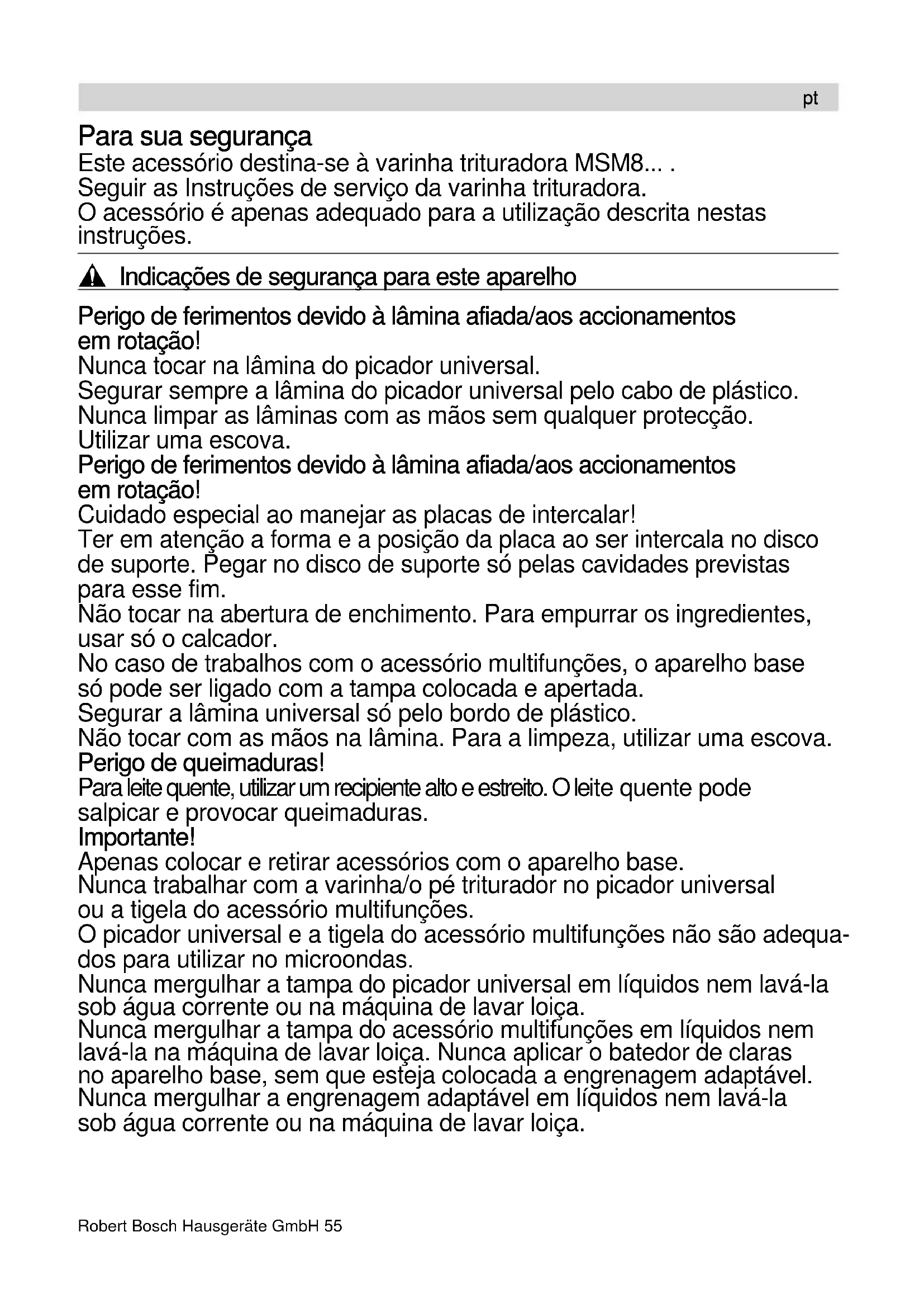 Nos reservamos el derecho de introducir modificaciones.Robert Bosch Hausgeräte GmbH 55 Para sua segurança Este acessório destina-se à varinha trituradora MSM8... . Seguir as Instruções de serviço da varinha trituradora. O acessório é apenas adequado para a utilização descrita nestas instruções.