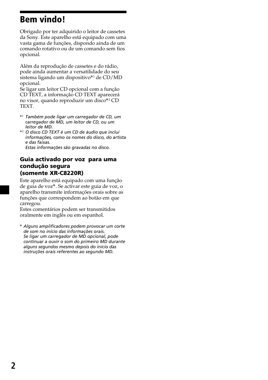 Bem vindo! Obrigado por ter adquirido o leitor de cassetes da Sony. Este aparelho está equipado com uma vasta gama de funções, dispondo ainda de um comando rotativo ou de um comando sem fios opcional. Além da reprodução de cassetes e do rádio, pode ainda aumentar a versatilidade do seu sistema ligando um dispositivo*1 de CD/MD opcional. Se ligar um leitor CD opcional com a função CD TEXT, a informação CD TEXT aparecerá no visor, quando reproduzir um disco*2 CD TEXT. *1 Também pode ligar um carregador de CD, um carregador de MD, um leitor de CD, ou um leitor de MD. 2 * O disco CD TEXT é um CD de áudio que inclui informações, como os nomes do disco, do artista e das faixas. Estas informações são gravadas no disco.
