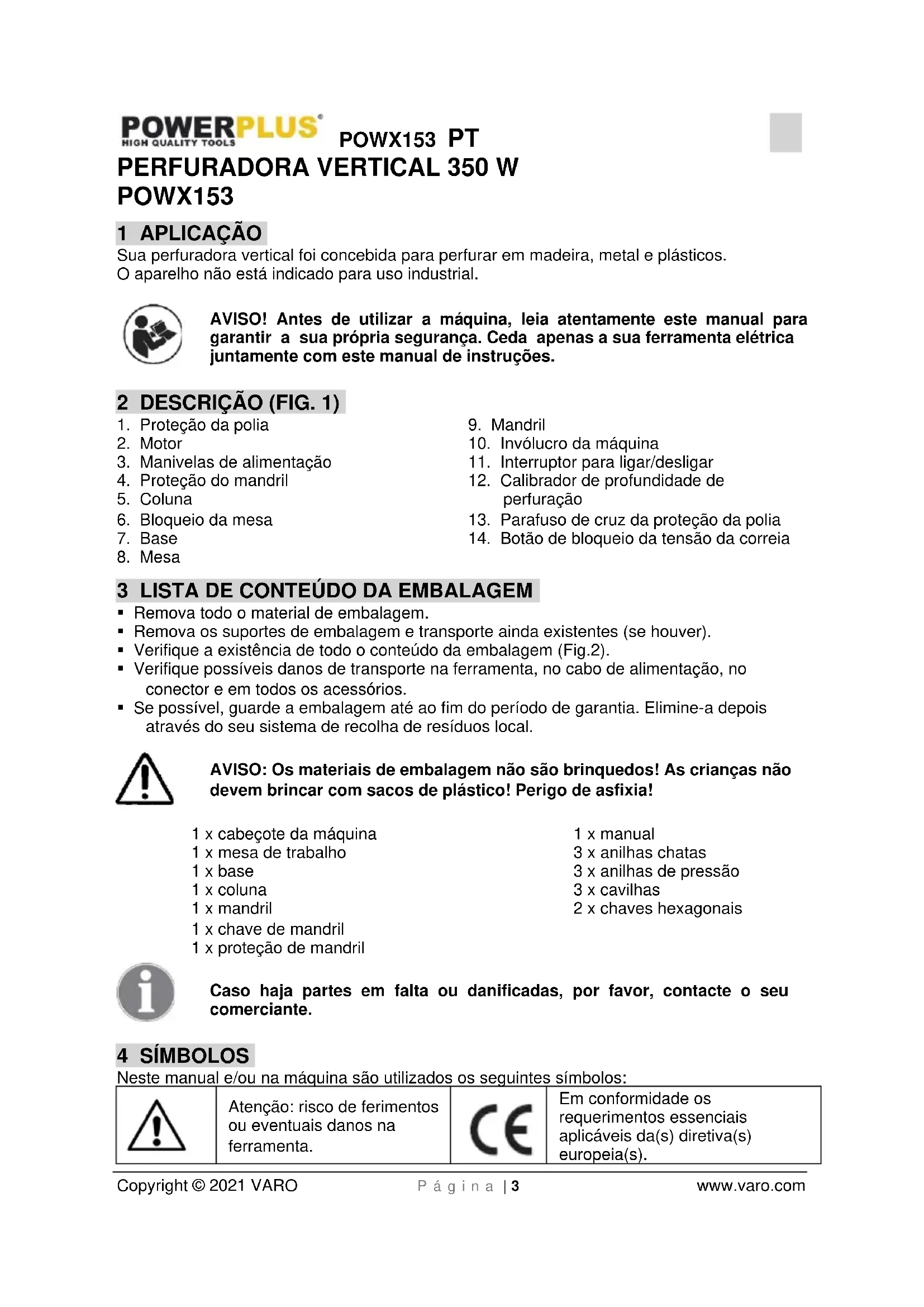 - VARO N.V. –Vic. Van Rompuy N.V.- Joseph Van Instraat 9 – BE2500 Lier – Bélgica, declara que, Designação do aparelho: Perfuradora vertical 350 W Marca: POWERplus Modelo nº.: POWX153 se encontra em conformidade com os requisitos essenciais e outras provisões relevantes das Diretivas Comunitárias aplicáveis, com base na aplicação das normas Europeias harmonizadas. Qualquer alteração não autorizada do equipamento anula esta declaração. Diretivas Europeias (incluindo, se aplicável, as respetivas emendas até à data de assinatura): 2011/65/EU 2006/42/EC 2014/30/EU Normas Europeias harmonizadas (incluindo, se aplicável, as respetivas emendas até à data de assinatura): EN62841-1 : 2015 EN62841-3-13 : 2017 EN55014-1 : 2017 EN55014-2 : 2015 EN61000-3-2 : 2014 EN61000-3-3 : 2013 Detentor da Documentação Técnica: Philippe Vankerkhove, VARO – Vic. Van Rompuy N.V. O signatário atua em nome da administração da empresa, Philippe Vankerkhove Assuntos Regulamentares – Gestor de Conformidade 21/01/2021, Lier - BelgiumPOWX153 NO Copyright © 2021 VARO Side | 1 www.varo.com 1 BRUKSOMRÅDE p. 3
