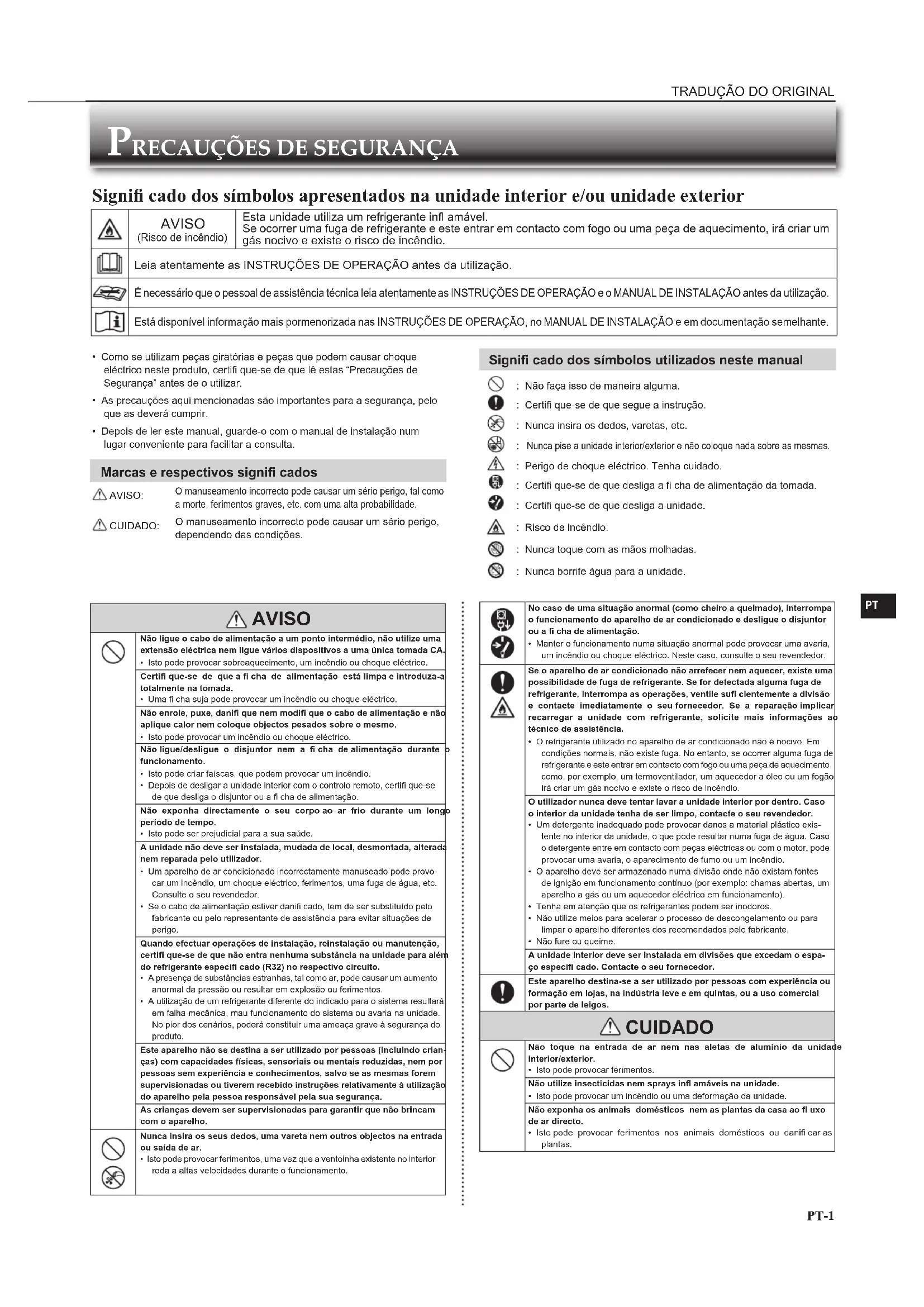 - Como se utilizam peças giratórias e peças que podem causar choque eléctrico neste produto, certifi que-se de que lê estas “Precauções de Segurança” antes de o utilizar.• As precauções aqui mencionadas são importantes para a segurança, pelo que as deverá cumprir.• Depois de ler este manual, guarde-o com o manual de instalação num lugar conveniente para facilitar a consulta. Marcas e respectivos signifi cados AVISO:O manuseamento incorrecto pode causar um sério perigo, tal como a morte, ferimentos graves, etc. com uma alta probabilidade. CUIDADO:O manuseamento incorrecto pode causar um sério perigo, dependendo das condições. Signifi cado dos símbolos utilizados neste manual : Não faça isso de maneira alguma. : Certifi que-se de que segue a instrução. : Nunca insira os dedos, varetas, etc. Nunca pise a unidade interior/exterior e não coloque nada sobre as mesmas. : Perigo de choque eléctrico. Tenha cuidado. : Certifi que-se de que desliga a fi cha de alimentação da tomada. : Certifi que-se de que desliga a unidade. : Risco de incêndio. : Nunca toque com as mãos molhadas. : Nunca borrife água para a unidade.