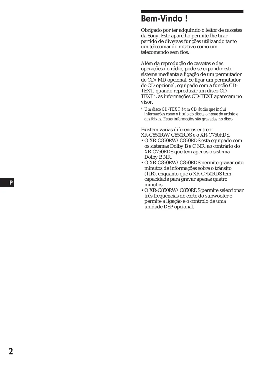 Bem-Vindo ! Obrigado por ter adquirido o leitor de cassetes da Sony. Este aparelho permite-lhe tirar partido de diversas funções utilizando tanto um telecomando rotativo como um telecomando sem fios. Além da reprodução de cassetes e das operações do rádio, pode-se expandir este sistema mediante a ligação de um permutador de CD/MD opcional. Se ligar um permutador de CD opcional, equipado com a função CDTEXT, quando reproduzir um disco CDTEXT*, as informações CD-TEXT aparecem no visor. * Um disco CD-TEXT é um CD áudio que inclui informações como o título do disco, o nome do artista e das faixas. Estas informações são gravadas no disco.