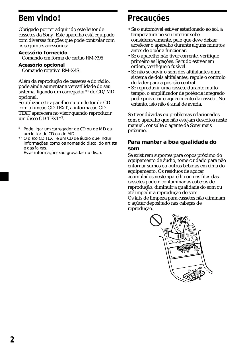Bem vindo! Precauções Obrigado por ter adquirido este leitor de cassetes da Sony. Este aparelho está equipado com diversas funções que pode controlar com os seguintes acessórios: Acessório fornecido Comando em forma de cartão RM-X96 Acessório opcional Comando rotativo RM-X4S