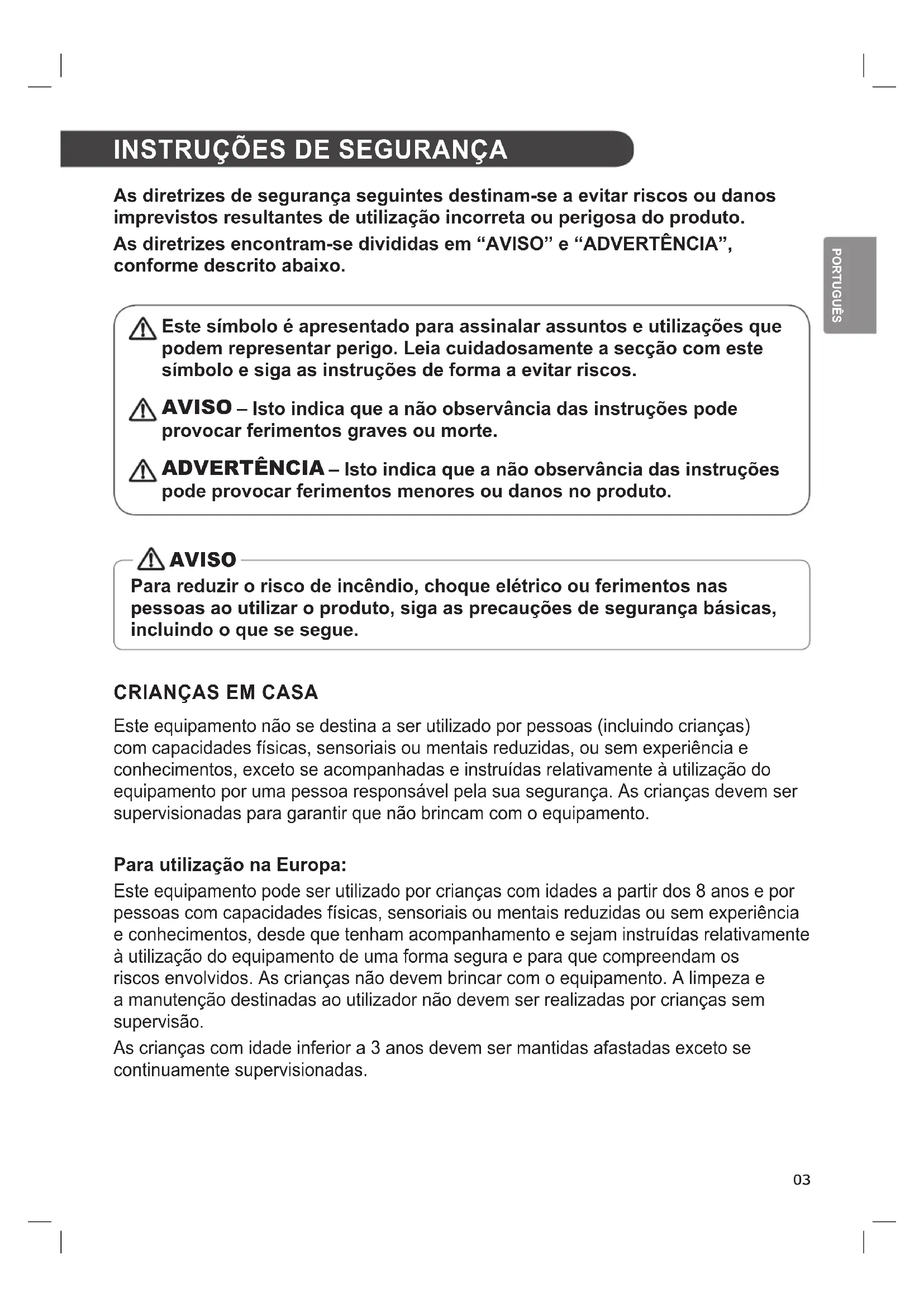Este equipamento não se destina a ser utilizado por pessoas (incluindo crianças) com capacidades físicas, sensoriais ou mentais reduzidas, ou sem experiência e conhecimentos, exceto se acompanhadas e instruídas relativamente à utilização do equipamento por uma pessoa responsável pela sua segurança. As crianças devem ser supervisionadas para garantir que não brincam com o equipamento. Para utilização na Europa: Este equipamento pode ser utilizado por crianças com idades a partir dos 8 anos e por pessoas com capacidades físicas, sensoriais ou mentais reduzidas ou sem experiência e conhecimentos, desde que tenham acompanhamento e sejam instruídas relativamente à utilização do equipamento de uma forma segura e para que compreendam os riscos envolvidos. As crianças não devem brincar com o equipamento. A limpeza e a manutenção destinadas ao utilizador não devem ser realizadas por crianças sem supervisão. As crianças com idade inferior a 3 anos devem ser mantidas afastadas exceto se continuamente supervisionadas.04