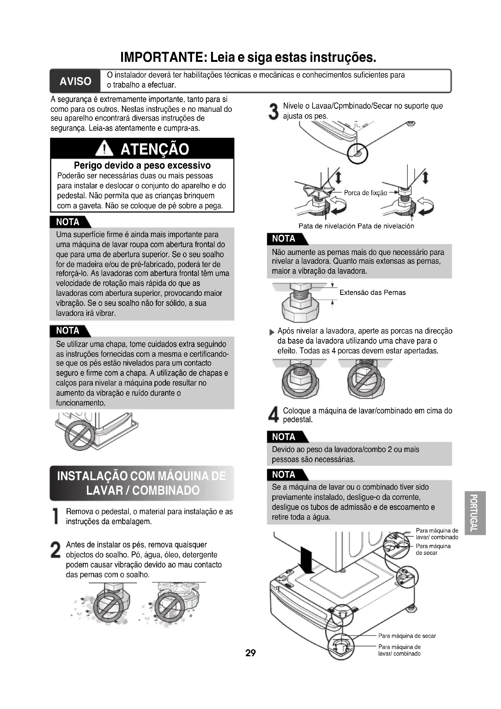 LAVAR / COMBINADO Antes de instalar os pés, remova quaisquerobjectos do soalho. Pó, água, óleo, detergentepodem causar vibração devido ao mau contactodas pernas com o soalho.Após nivelar a lavadora, aperte as porcas na direcçãoda base da lavadora utilizando uma chave para oefeito. Todas as 4 porcas devem estar apertadas.Nivele o Lavaa/Cpmbinado/Secar no suporte queajusta os pes. NOTA Se utilizar uma chapa, tome cuidados extra seguindoas instruções fornecidas com a mesma e certificando-se que os pés estão nivelados para um contactoseguro e firme com a chapa. A utilização de chapas ecalços para nivelar a máquina pode resultar noaumento da vibração e ruído durante ofuncionamento. NOTA Não aumente as pernas mais do que necessário paranivelar a lavadora. Quanto mais extensas as pernas,maior a vibração da lavadora. NOTA Devido ao peso da lavadora/combo 2 ou maispessoas são necessárias. NOTA Se a máquina de lavar ou o combinado tiver sidopreviamente instalado, desligue-o da corrente,desligue os tubos de admissão e de escoamento eretire toda a água. NOTA Uma superfície firme é ainda mais importante parauma máquina de lavar roupa com abertura frontal doque para uma de abertura superior. Se o seu soalhofor de madeira e/ou de pré-fabricado, poderá ter dereforçá-lo. As lavadoras com abertura frontal têm umavelocidade de rotação mais rápida do que aslavadoras com abertura superior, provocando maiorvibração. Se o seu soalho não for sólido, a sualavadora irá vibrar.PORTUGAL30 Certifique-se de que os orifícios nos pés estão alinhados com os orifícios no aparelho e instale os 4 parafusos em cada canto apertando-os firmemente. Nivele o Lavaa/Cpmbinado no suporte que ajusta os pés. Porca de fixção Pata de nivelación Pata de nivelación Coloque a máquina de lavar/combinado no local pretendido. Verificação Diagonal Quando desce as pontas da máquina de lavar roupa para a chapa na diagonal, a máquina não deve ser mover-se nem para cima nem para baixo! (Verifique as instruções) Se a máquina abanar quando puxar a placa superior da mesma, ajuste novamente os pés. NOTA Para se certificar de que a lavadora está devidamente nivelada, ligue-a com uma carga de teste: coloque aprox. 2,7KG de roupa na lavadora. Pressione POWER, pressione RINSE+SPIN, e pressione o botão START/PAUSE. Consulte as seguintes secções para informação adicional acerca da selecção do ciclo de lavagem. Certifique-se de que a lavadora não vibra ou abana excessivamente durante o ciclo de torção. Se a lavador vibrar ou abanar, ajuste o nível dos pés até estabilizar. NOTA A má instalação dos parafusos pode resultar em vibração e ruído. NOTA O conjunto do aparelho e do pedestal deve ser colocado num piso sólido e direito, para que o aparelho funcione correctamente. Ajuste os pés do aparelho e do pedestal, rodando-os com a ajuda de uma chave de parafusos. Em seguida, ajuste a porca de fixação ao pedestal, segurando o pé do mesmo com uma chave de parafusos. O instalador deverá ter habilitações técnicas e mecânicas e conhecimentos suficientes para o trabalho a efectuar. NOTA Porca de fixção Pata de nivelación Pata de nivelación PORTUGAL31 Devido ao peso da máquina de secar, poderão ser necessárias duas ou mais pessoas. NOTA Remove pedestal,installation hardware, and instructions from the shipping carton. Certifique-se de que os orifícios nos pés estão alinhados com os orifícios no aparelho e instale os 2 parafusos em cada canto apertando-os firmemente.