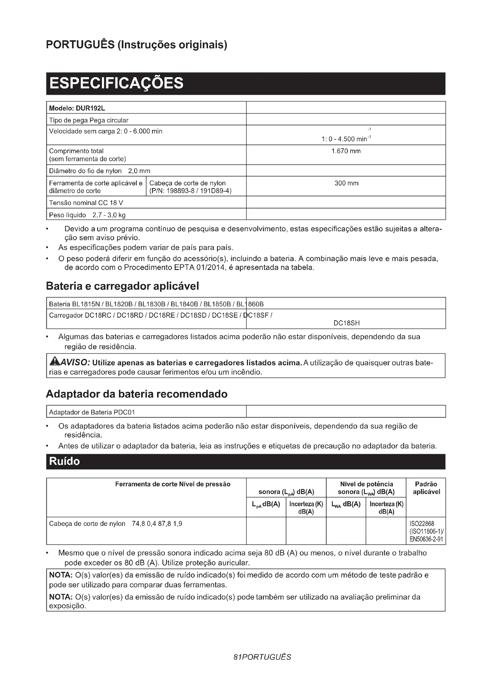 - Antesdeutilizaroadaptadordabateria,leiaasinstruçõeseetiquetasdeprecauçãonoadaptadordabateria. Ruído Ferramenta de corte Nível de pressão sonora (L