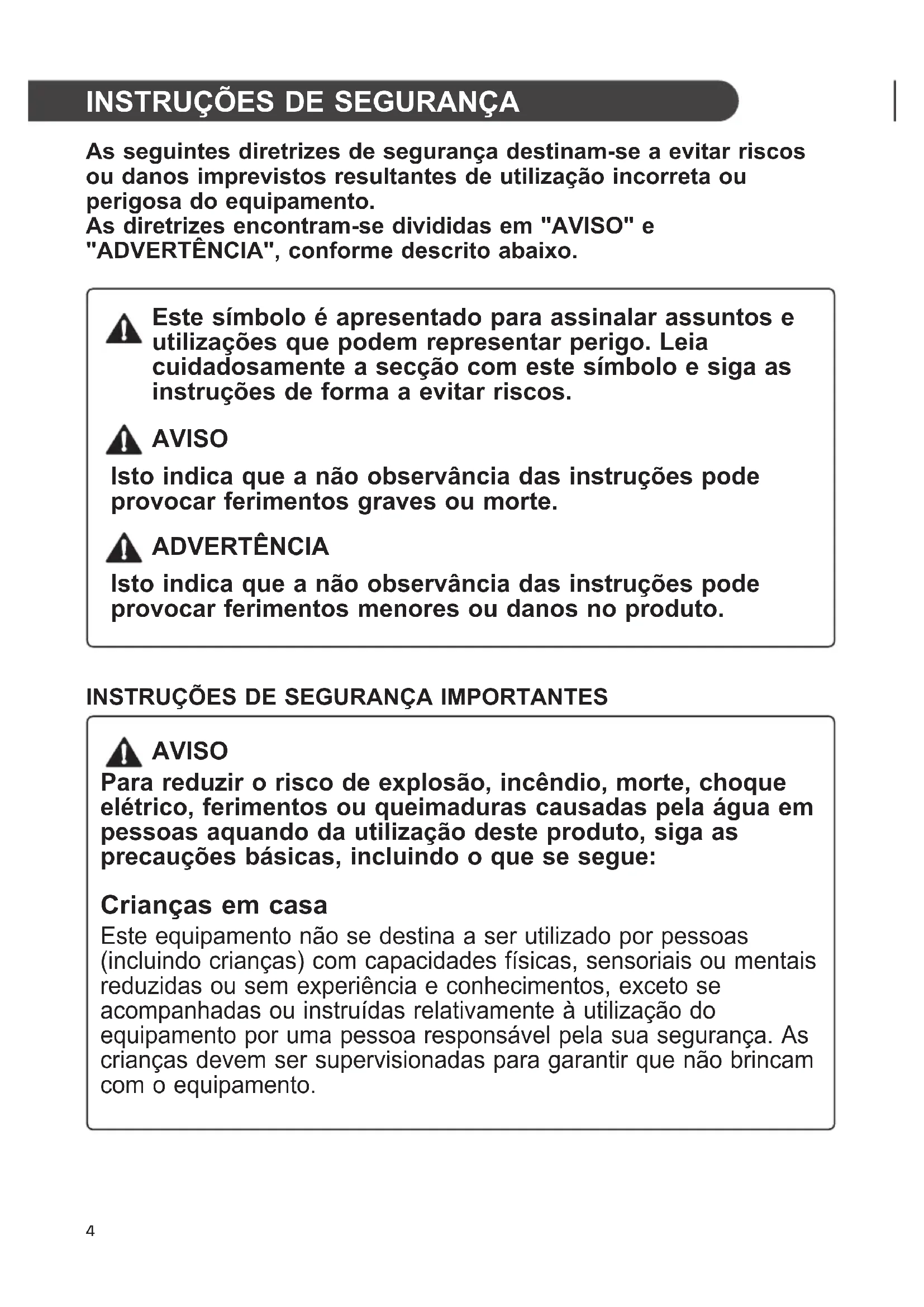 AVISO Para reduzir o risco de explosão, incêndio, morte, choque elétrico, ferimentos ou queimaduras causadas pela água em pessoas aquando da utilização deste produto, siga as precauções básicas, incluindo o que se segue: Crianças em casa Este equipamento não se destina a ser utilizado por pessoas (incluindo crianças) com capacidades físicas, sensoriais ou mentais reduzidas ou sem experiência e conhecimentos, exceto se acompanhadas ou instruídas relativamente à utilização do equipamento por uma pessoa responsável pela sua segurança. As crianças devem ser supervisionadas para garantir que não brincam com o equipamento.5