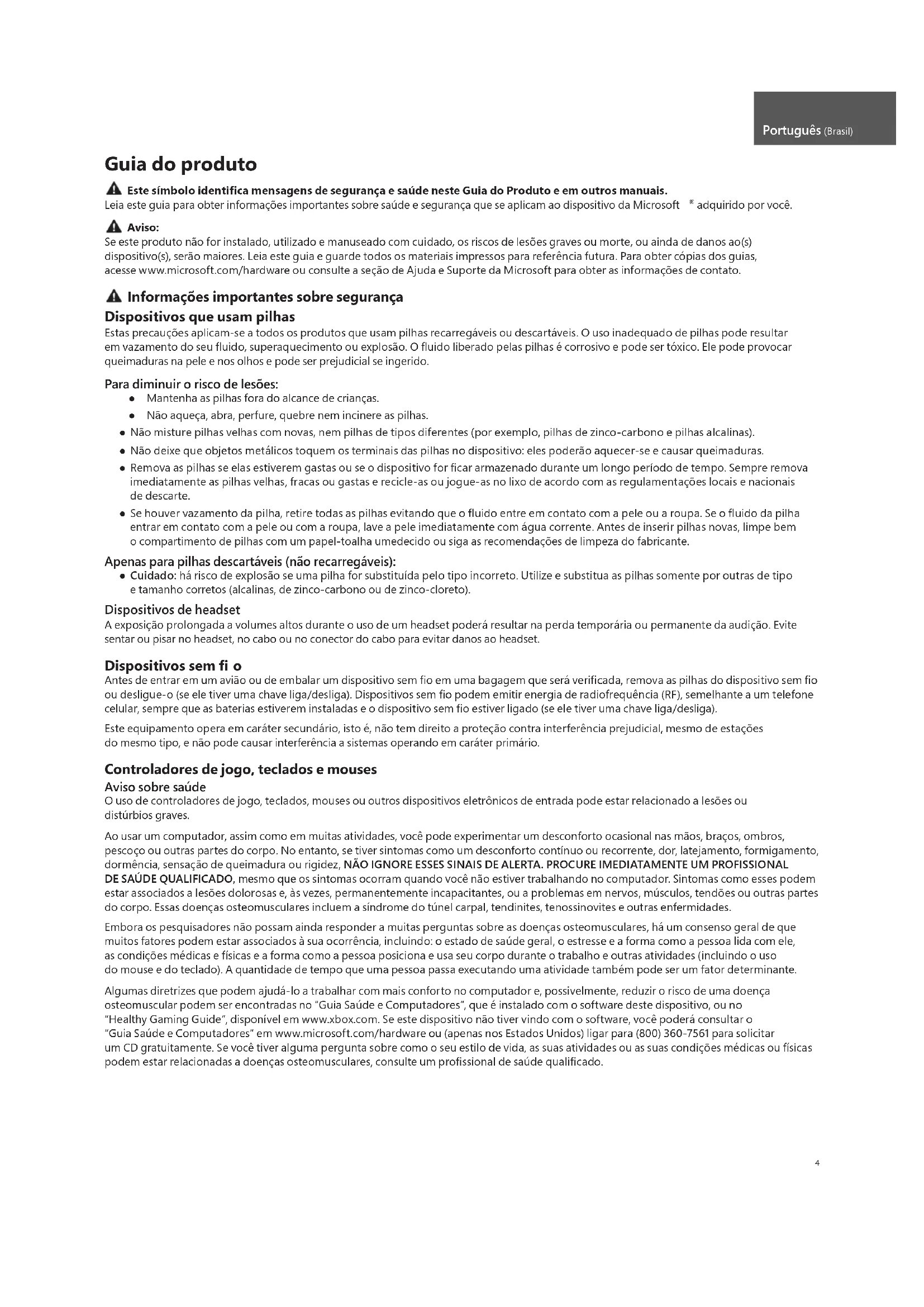 adquirido por você. Aviso: Se este produto não for instalado, utilizado e manuseado com cuidado, os riscos de lesões graves ou morte, ou ainda de danos ao(s) dispositivo(s), serão maiores. Leia este guia e guarde todos os materiais impressos para referência futura. Para obter cópias dos guias, acesse www.microsoft.com/hardware ou consulte a seção de Ajuda e Suporte da Microsoft para obter as informações de contato. Informações importantes sobre segurança Dispositivos que usam pilhas Estas precauções aplicam-se a todos os produtos que usam pilhas recarregáveis ou descartáveis. O uso inadequado de pilhas pode resultar em vazamento do seu fl uido, superaquecimento ou explosão. O fl uido liberado pelas pilhas é corrosivo e pode ser tóxico. Ele pode provocar queimaduras na pele e nos olhos e pode ser prejudicial se ingerido. Para diminuir o risco de lesões: ● Mantenha as pilhas fora do alcance de crianças. ● Não aqueça, abra, perfure, quebre nem incinere as pilhas. ● Não misture pilhas velhas com novas, nem pilhas de tipos diferentes (por exemplo, pilhas de zinco-carbono e pilhas alcalinas). ● Não deixe que objetos metálicos toquem os terminais das pilhas no dispositivo: eles poderão aquecer-se e causar queimaduras. ● Remova as pilhas se elas estiverem gastas ou se o dispositivo for ficar armazenado durante um longo período de tempo. Sempre remova imediatamente as pilhas velhas, fracas ou gastas e recicle-as ou jogue-as no lixo de acordo com as regulamentações locais e nacionais de descarte. ● Se houver vazamento da pilha, retire todas as pilhas evitando que o fluido entre em contato com a pele ou a roupa. Se o fluido da pilha entrar em contato com a pele ou com a roupa, lave a pele imediatamente com água corrente. Antes de inserir pilhas novas, limpe bem o compartimento de pilhas com um papel-toalha umedecido ou siga as recomendações de limpeza do fabricante. Apenas para pilhas descartáveis (não recarregáveis): ● Cuidado: há risco de explosão se uma pilha for substituída pelo tipo incorreto. Utilize e substitua as pilhas somente por outras de tipo e tamanho corretos (alcalinas, de zinco-carbono ou de zinco-cloreto). Dispositivos de headset A exposição prolongada a volumes altos durante o uso de um headset poderá resultar na perda temporária ou permanente da audição. Evite sentar ou pisar no headset, no cabo ou no conector do cabo para evitar danos ao headset. Dispositivos sem fi o Antes de entrar em um avião ou de embalar um dispositivo sem fi o em uma bagagem que será verifi cada, remova as pilhas do dispositivo sem fi o ou desligue-o (se ele tiver uma chave liga/desliga). Dispositivos sem fi o podem emitir energia de radiofrequência (RF), semelhante a um telefone celular, sempre que as baterias estiverem instaladas e o dispositivo sem fi o estiver ligado (se ele tiver uma chave liga/desliga). Este equipamento opera em caráter secundário, isto é, não tem direito a proteção contra interferência prejudicial, mesmo de estações do mesmo tipo, e não pode causar interferência a sistemas operando em caráter primário. Controladores de jogo, teclados e mouses Aviso sobre saúde O uso de controladores de jogo, teclados, mouses ou outros dispositivos eletrônicos de entrada pode estar relacionado a lesões ou distúrbios graves. Ao usar um computador, assim como em muitas atividades, você pode experimentar um desconforto ocasional nas mãos, braços, ombros, pescoço ou outras partes do corpo. No entanto, se tiver sintomas como um desconforto contínuo ou recorrente, dor, latejamento, formigamento, dormência, sensação de queimadura ou rigidez, NÃO IGNORE ESSES SINAIS DE ALERTA. PROCURE IMEDIATAMENTE UM PROFISSIONAL DE SAÚDE QUALIFICADO, mesmo que os sintomas ocorram quando você não estiver trabalhando no computador. Sintomas como esses podem estar associados a lesões dolorosas e, às vezes, permanentemente incapacitantes, ou a problemas em nervos, músculos, tendões ou outras partes do corpo. Essas doenças osteomusculares incluem a síndrome do túnel carpal, tendinites, tenossinovites e outras enfermidades. Embora os pesquisadores não possam ainda responder a muitas perguntas sobre as doenças osteomusculares, há um consenso geral de que muitos fatores podem estar associados à sua ocorrência, incluindo: o estado de saúde geral, o estresse e a forma como a pessoa lida com ele, as condições médicas e físicas e a forma como a pessoa posiciona e usa seu corpo durante o trabalho e outras atividades (incluindo o uso do mouse e do teclado). A quantidade de tempo que uma pessoa passa executando uma atividade também pode ser um fator determinante. Algumas diretrizes que podem ajudá-lo a trabalhar com mais conforto no computador e, possivelmente, reduzir o risco de uma doença osteomuscular podem ser encontradas no “Guia Saúde e Computadores”, que é instalado com o software deste dispositivo, ou no “Healthy Gaming Guide”, disponível em www.xbox.com. Se este dispositivo não tiver vindo com o software, você poderá consultar o “Guia Saúde e Computadores” em www.microsoft.com/hardware ou (apenas nos Estados Unidos) ligar para (800) 360-7561 para solicitar um CD gratuitamente. Se você tiver alguma pergunta sobre como o seu estilo de vida, as suas atividades ou as suas condições médicas ou físicas podem estar relacionadas a doenças osteomusculares, consulte um profi ssional de saúde qualifi cado. Português (Brasil)5 Convulsões por fotossensibilidade Um número muito reduzido de pessoas pode ter um ataque epiléptico ao serem expostas a determinadas imagens visuais, inclusive luzes ou padrões brilhantes que podem aparecer em videogames. Mesmo pessoas sem quaisquer antecedentes de tais ataques ou de epilepsia poderão sofrer de sintomas não diagnosticados que podem provocar estes “ataques de epilepsia fotossensível” ao verem videogames. Esses ataques podem ter diversos sintomas, incluind