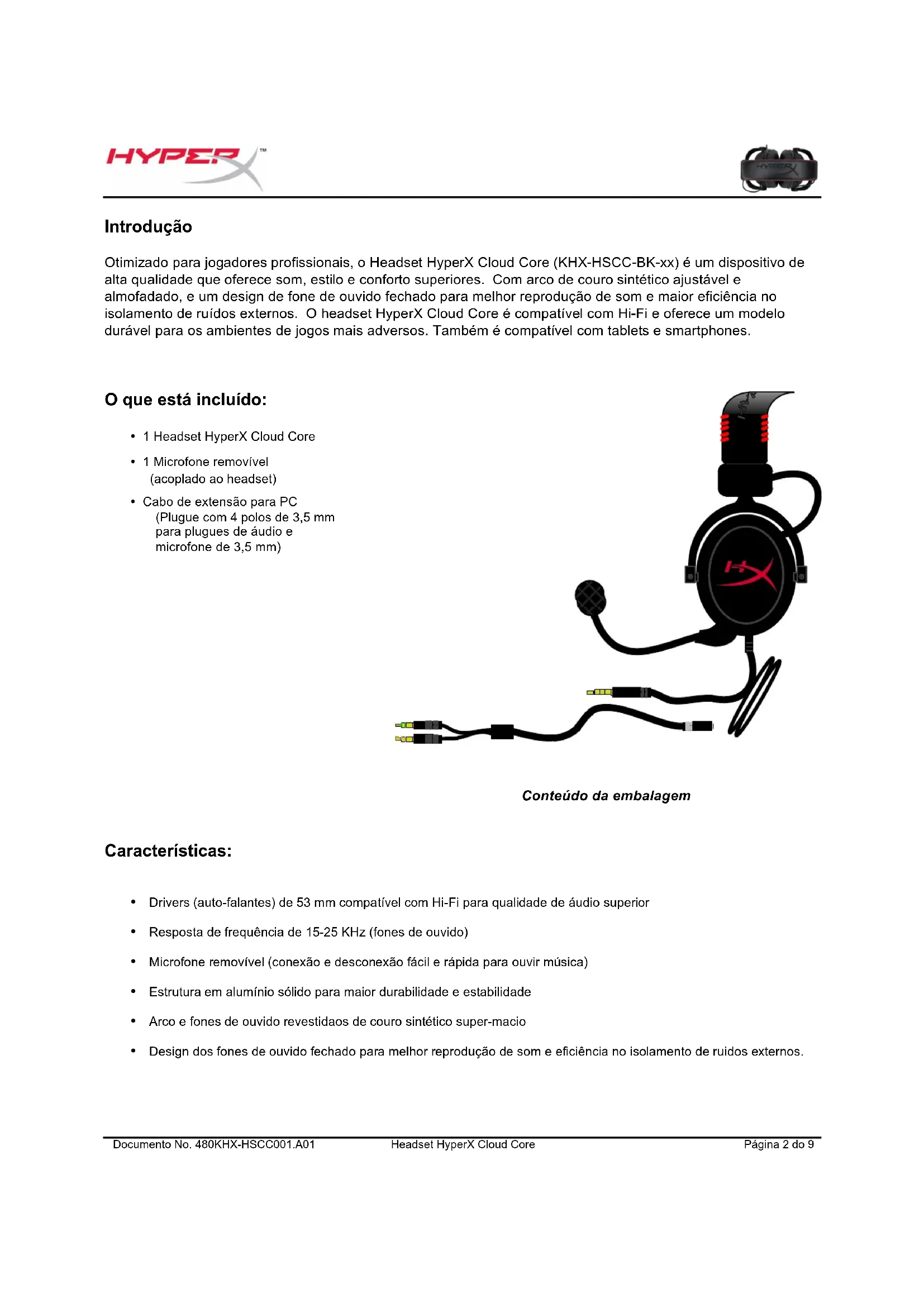 - Design dos fones de ouvido fechado para melhor reprodução de som e eficiência no isolamento de ruidos externos.Documento No. 480KHX-HSCC001.A01 Headset HyperX Cloud Core Página 3 do 9