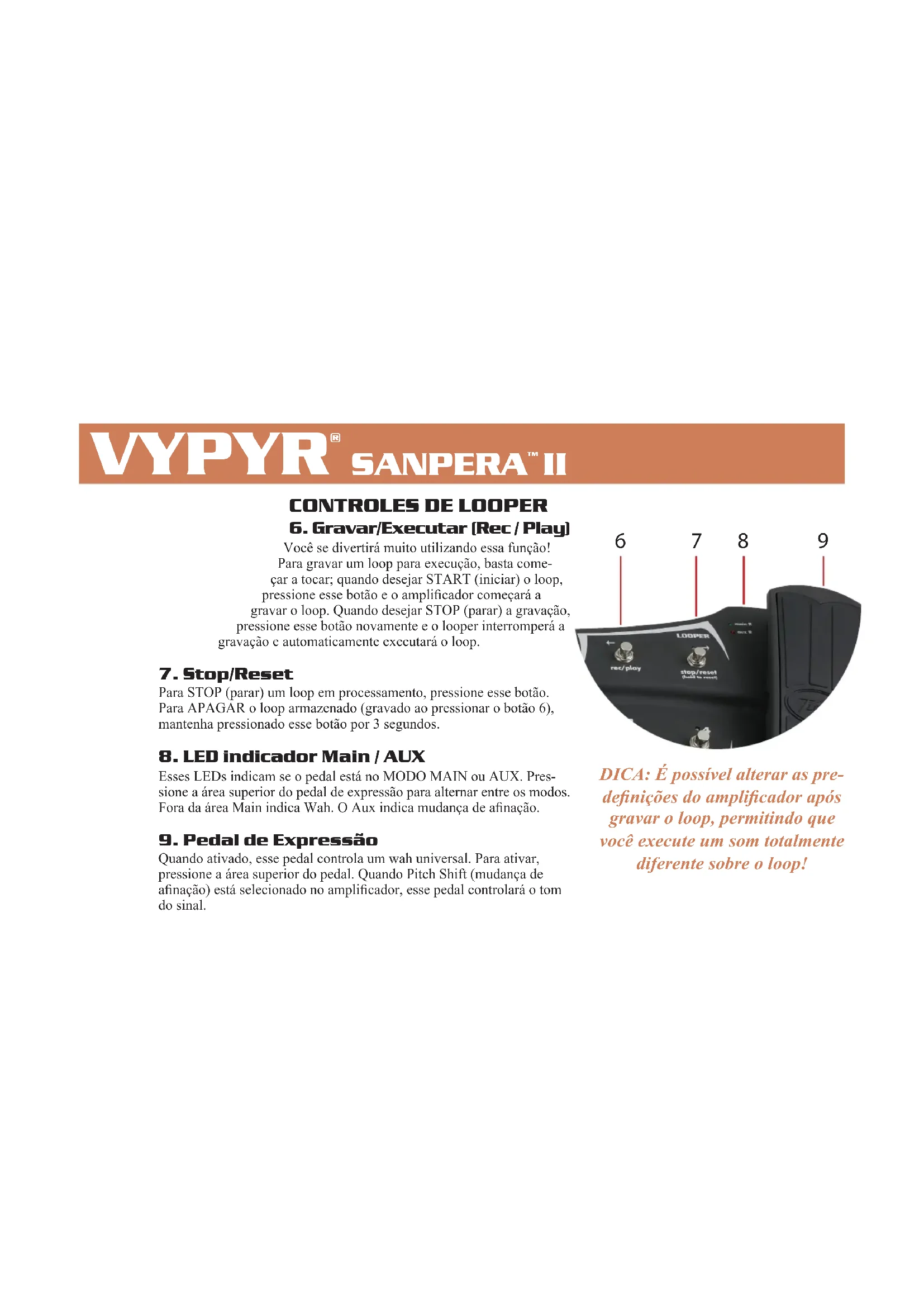 6. Gravar/Executar (Rec / Play) Você se divertirá muito utilizando essa função! Para gravar um loop para execução, basta come-çar a tocar; quando desejar START (iniciar) o loop, pressione esse botão e o amplicador começará a gravar o loop. Quando desejar STOP (parar) a gravação, pressione esse botão novamente e o looper interromperá a gravação e automaticamente executará o loop.7. Stop/ResetPara STOP (parar) um loop em processamento, pressione esse botão. Para APAGAR o loop armazenado (gravado ao pressionar o botão 6), mantenha pressionado esse botão por 3 segundos.8. LED indicador Main / AUXEsses LEDs indicam se o pedal está no MODO MAIN ou AUX. Pres-sione a área superior do pedal de expressão para alternar entre os modos. Fora da área Main indica Wah. O Aux indica mudança de anação.9. Pedal de ExpressãoQuando ativado, esse pedal controla um wah universal. Para ativar, pressione a área superior do pedal. Quando Pitch Shift (mudança de anação) está selecionado no amplicador, esse pedal controlará o tom do sinal.
