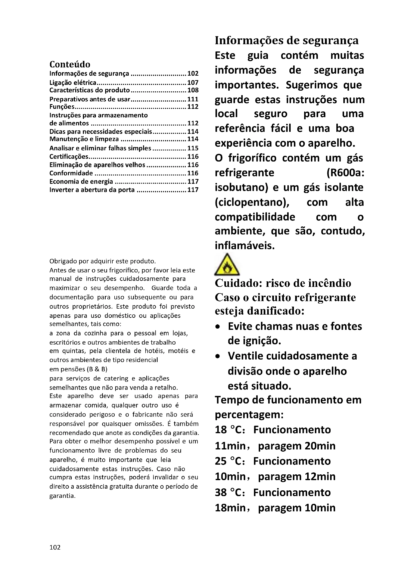 Obrigado por adquirir este produto. Antes de usar o seu frigorífico, por favor leia este manual de instruções cuidadosamente para maximizar o seu desempenho. Guarde toda a documentação para uso subsequente ou para outros proprietários. Este produto foi previsto apenas para uso doméstico ou aplicações semelhantes, tais como: a zona da cozinha para o pessoal em lojas, escritórios e outros ambientes de trabalho em quintas, pela clientela de hotéis, motéis e outros ambientes de tipo residencial em pensões (B & B) para serviços de catering e aplicações semelhantes que não para venda a retalho. Este aparelho deve ser usado apenas para armazenar comida, qualquer outro uso é considerado perigoso e o fabricante não será responsável por quaisquer omissões. É também recomendado que anote as condições da garantia. Para obter o melhor desempenho possível e um funcionamento livre de problemas do seu aparelho, é muito importante que leia cuidadosamente estas instruções. Caso não cumpra estas instruções, poderá invalidar o seu direito a assistência gratuita durante o período de garantia. Informações de segurança Este guia contém muitas informações de segurança importantes. Sugerimos que guarde estas instruções num local seguro para uma referência fácil e uma boa experiência com o aparelho. O frigorífico contém um gás refrigerante (R600a: isobutano) e um gás isolante (ciclopentano), com alta compatibilidade com o ambiente, que são, contudo, inflamáveis. Cuidado: risco de incêndio Caso o circuito refrigerante esteja danificado: