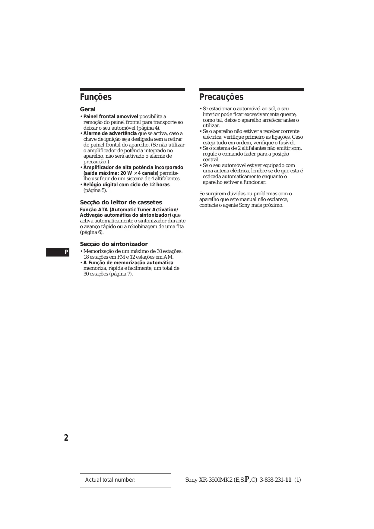 Actual total number Sony XR-3500MK2 (E,S,P,C) 3-858-231-11 (1) Funções Precauções Geral