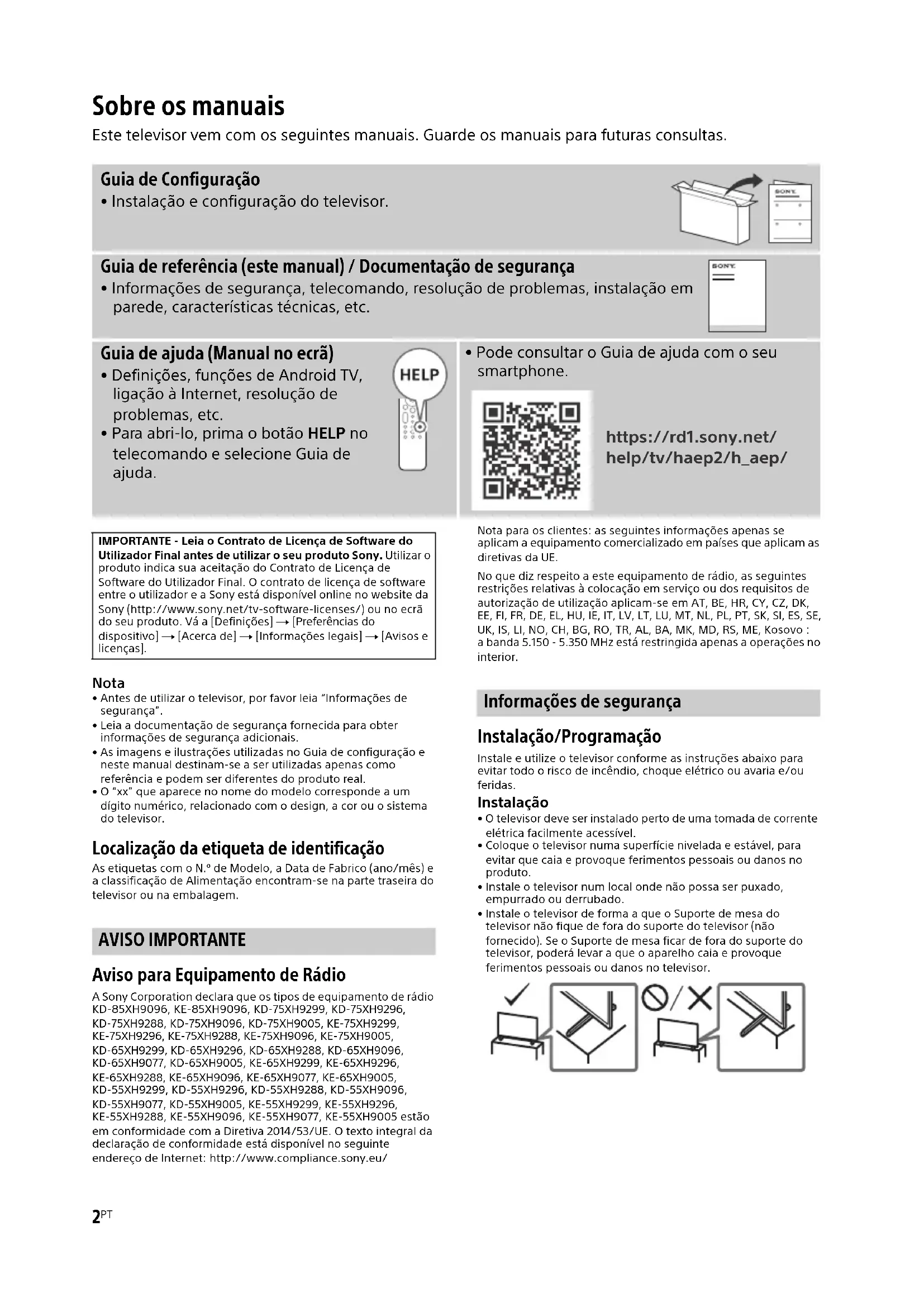 - Antes de utilizar o televisor, por favor leia “Informações de segurança”.• Leia a documentação de segurança fornecida para obter informações de segurança adicionais.• As imagens e ilustrações utilizadas no Guia de configuração e neste manual destinam-se a ser utilizadas apenas como referência e podem ser diferentes do produto real.• O “xx” que aparece no nome do modelo corresponde a um dígito numérico, relacionado com o design, a cor ou o sistema do televisor. Localização da etiqueta de identificação As etiquetas com o N.º de Modelo, a Data de Fabrico (ano/mês) e a classificação de Alimentação encontram-se na parte traseira do televisor ou na embalagem. AVISO IMPORTANTE Aviso para Equipamento de Rádio A Sony Corporation declara que os tipos de equipamento de rádio KD-85XH9096, KE-85XH9096, KD-75XH9299, KD-75XH9296, KD-75XH9288, KD-75XH9096, KD-75XH9005, KE-75XH9299, KE-75XH9296, KE-75XH9288, KE-75XH9096, KE-75XH9005, KD-65XH9299, KD-65XH9296, KD-65XH9288, KD-65XH9096, KD-65XH9077, KD-65XH9005, KE-65XH9299, KE-65XH9296, KE-65XH9288, KE-65XH9096, KE-65XH9077, KE-65XH9005, KD-55XH9299, KD-55XH9296, KD-55XH9288, KD-55XH9096, KD-55XH9077, KD-55XH9005, KE-55XH9299, KE-55XH9296, KE-55XH9288, KE-55XH9096, KE-55XH9077, KE-55XH9005 estão em conformidade com a Diretiva 2014/53/UE. O texto integral da declaração de conformidade está disponível no seguinte endereço de Internet: http://www.compliance.sony.eu/Nota para os clientes: as seguintes informações apenas se aplicam a equipamento comercializado em países que aplicam as diretivas da UE.No que diz respeito a este equipamento de rádio, as seguintes restrições relativas à colocação em serviço ou dos requisitos de autorização de utilização aplicam-se em AT, BE, HR, CY, CZ, DK, EE, FI, FR, DE, EL, HU, IE, IT, LV, LT, LU, MT, NL, PL, PT, SK, SI, ES, SE, UK, IS, LI, NO, CH, BG, RO, TR, AL, BA, MK, MD, RS, ME, Kosovo :a banda 5.150 - 5.350 MHz está restringida apenas a operações no interior. Informações de segurança Instalação/Programação Instale e utilize o televisor conforme as instruções abaixo para evitar todo o risco de incêndio, choque elétrico ou avaria e/ou feridas. Instalação
