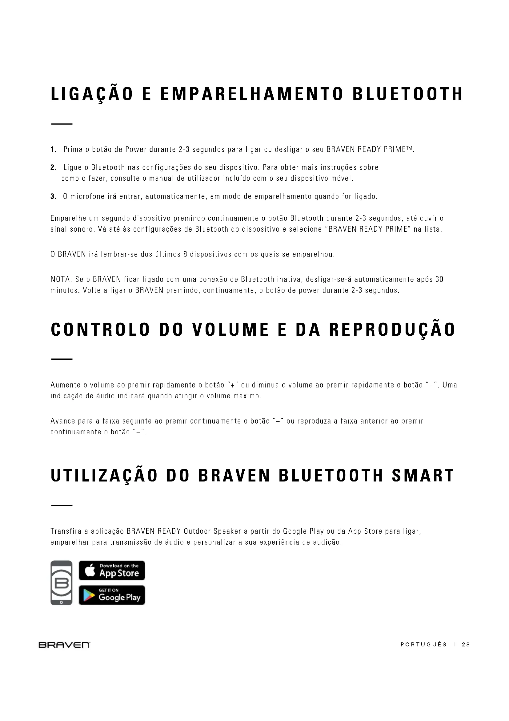 Emparelhe um segundo dispositivo premindo continuamente o botão Bluetooth durante 2-3 segundos, até ouvir o sinal sonoro. Vá até às configurações de Bluetooth do dispositivo e selecione “BRAVEN READY PRIME” na lista. O BRAVEN irá lembrar-se dos últimos 8 dispositivos com os quais se emparelhou. NOTA: Se o BRAVEN ficar ligado com uma conexão de Bluetooth inativa, desligar-se-á automaticamente após 30 minutos. Volte a ligar o BRAVEN premindo, continuamente, o botão de power durante 2-3 segundos.PORTUGUÊS | 29