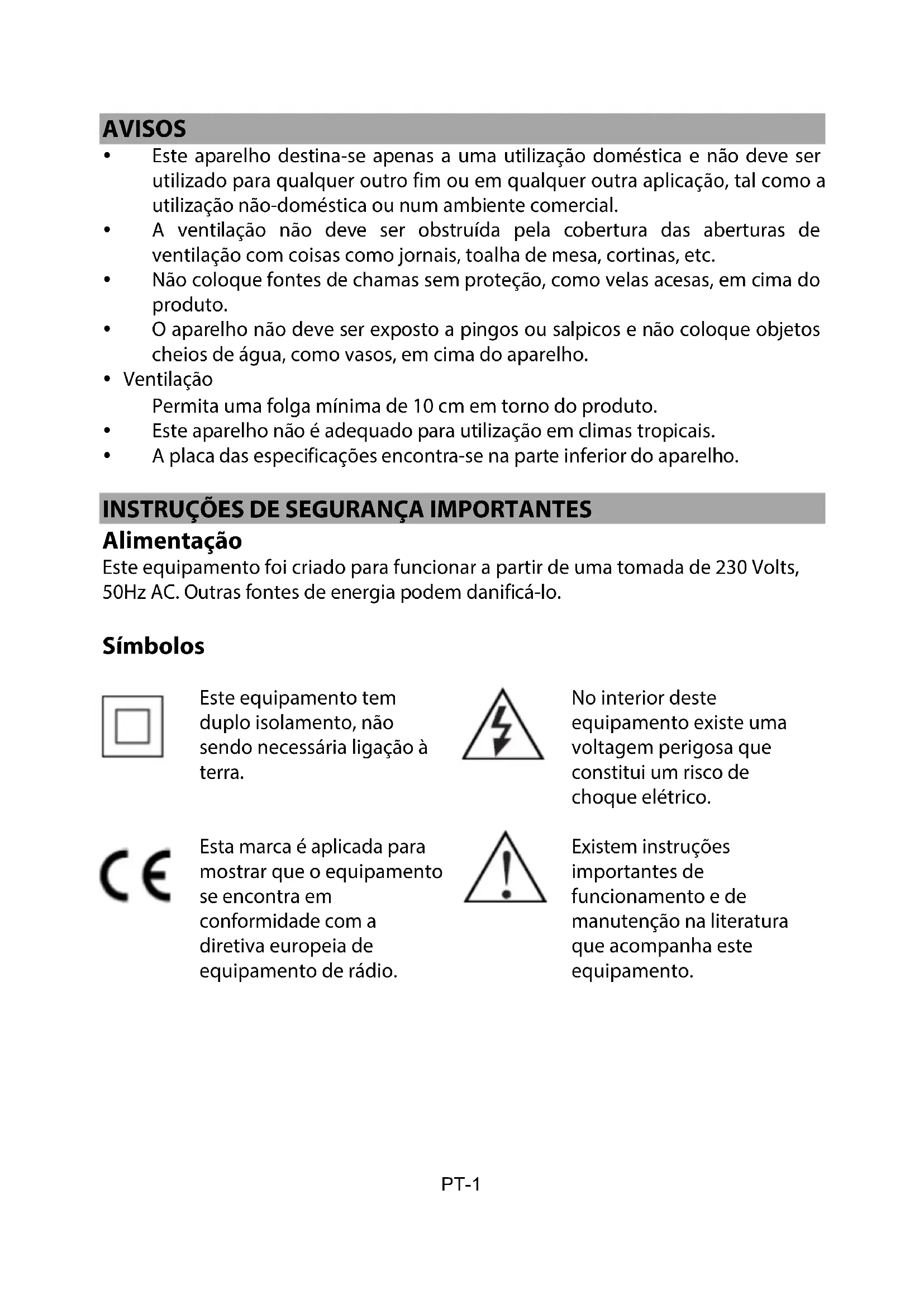 Para comprobar el tiempo restante antes de que se apague, pulse SLEEP. Para cancelar la función de apagado automático, pulse SLEEP hasta que aparezca "OFF" en la pantalla. Para apagar la radio antes de que se apague automáticamente, pulse POWER. ESPECIFICACIONES Alimentación : CA 230 V~ 50 Hz, 5 W Rango de frecuencia : AM 522-1620 kHz FM 87,5 – 108 MHz Consumo energético (solo reloj) : < 1 W Potencia de salida : 0,3 W Pilas de reserva del reloj : 2 pilas AAA de 1,5 V (no incluidas) Corriente alternaES-7PT-1 AVISOS Este aparelho destina-se apenas a uma utilização doméstica e não deve ser utilizado para qualquer outro fim ou em qualquer outra aplicação, tal como a utilização não-doméstica ou num ambiente comercial. A ventilação não deve ser obstruída pela cobertura das aberturas de ventilação com coisas como jornais, toalha de mesa, cortinas, etc. Não coloque fontes de chamas sem proteção, como velas acesas, em cima do produto. O aparelho não deve ser exposto a pingos ou salpicos e não coloque objetos cheios de água, como vasos, em cima do aparelho. Ventilação Permita uma folga mínima de 10 cm em torno do produto. Este aparelho não é adequado para utilização em climas tropicais. A placa das especificações encontra-se na parte inferior do aparelho.
