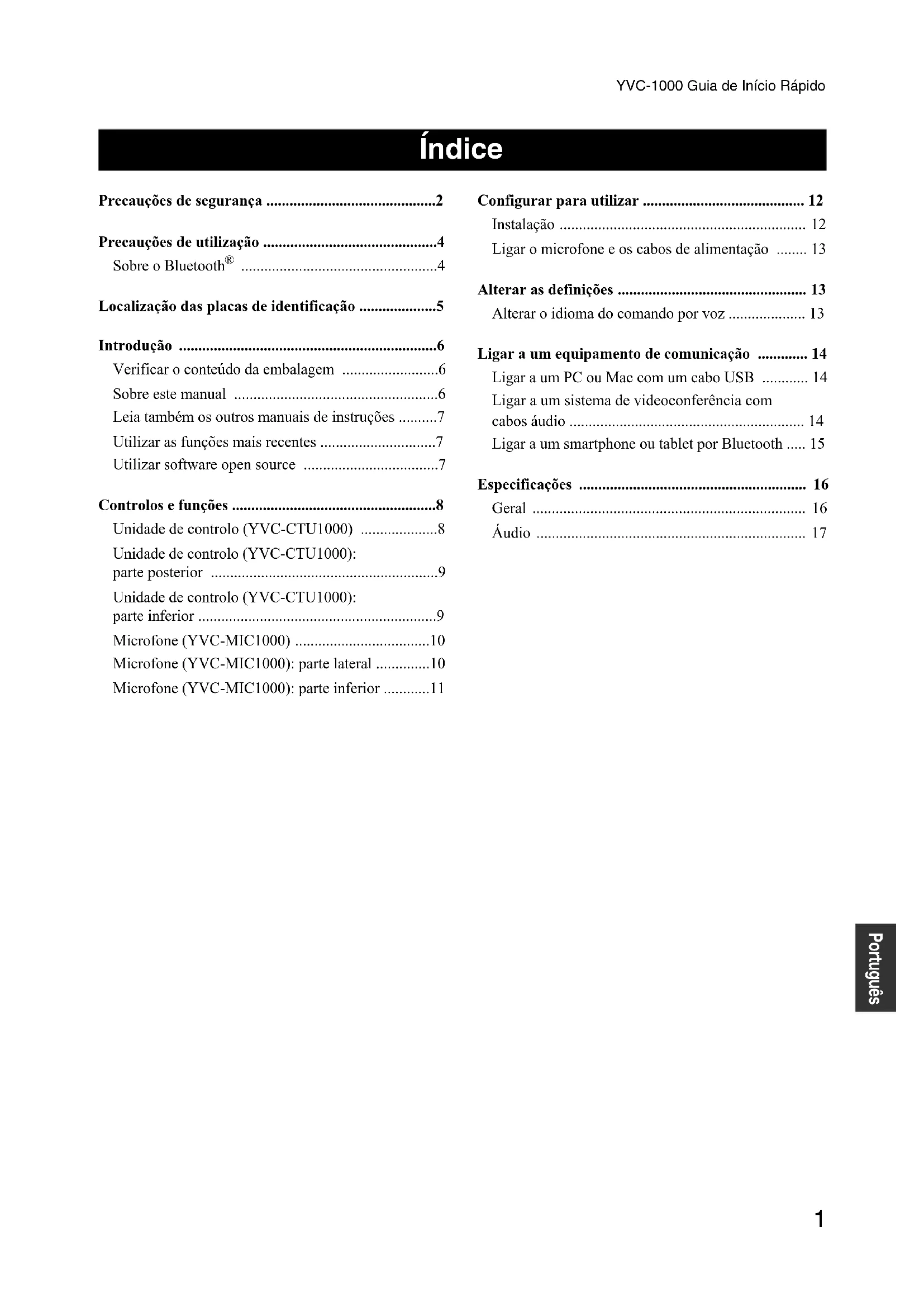 - Áudio ÍndiceYVC-1000 Guia de Início Rápido p. 17