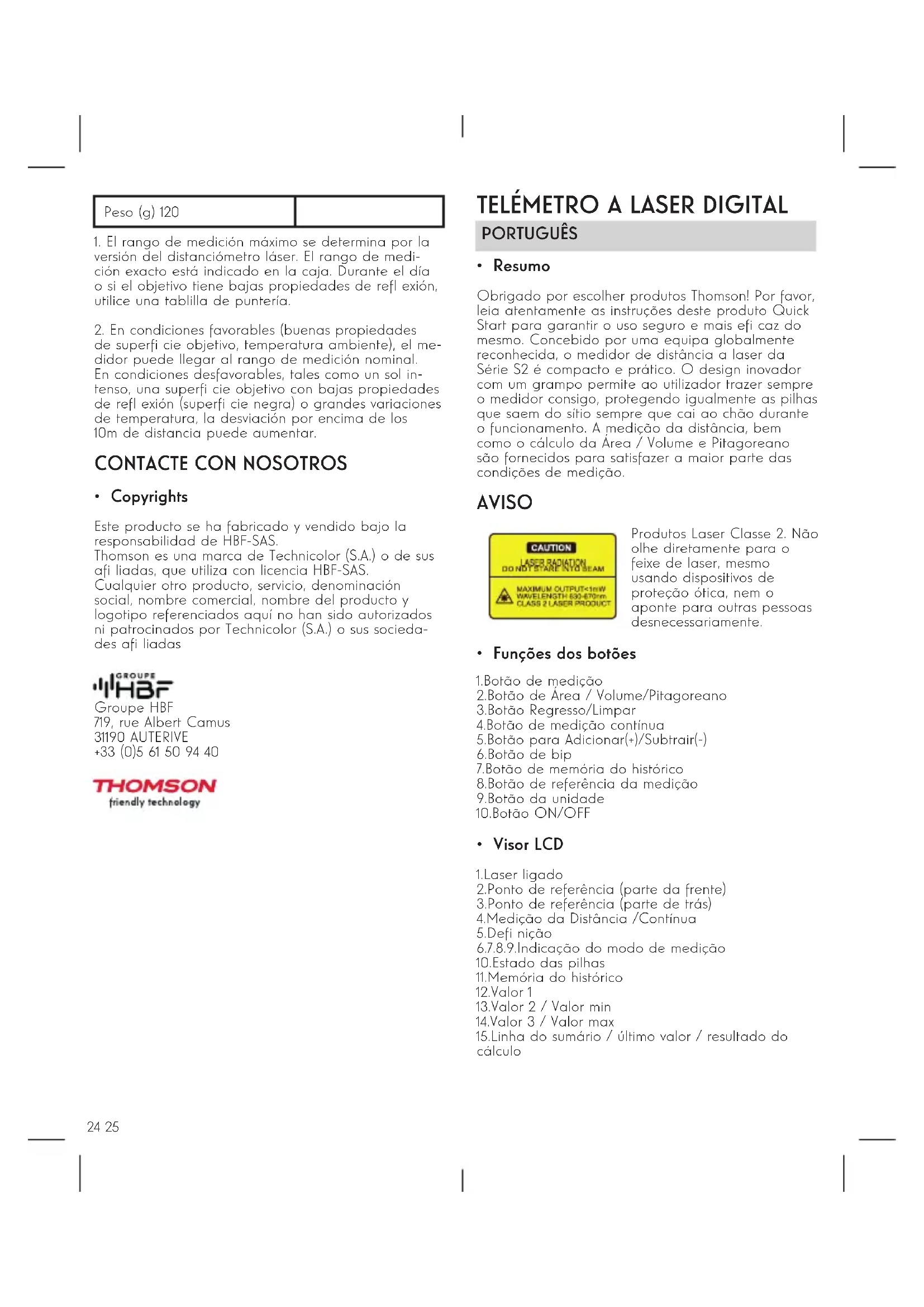 - Direitos de autor Este produto foi fabricado e vendido sob a respon- sabilidade da HBF-SAS. A Thomson é uma marca da Technicolor (S.A.) ou suas afi liadas, licenciada sob HBF-SAS. Groupe HBF 719, rue Albert Camus 31190 AUTERIVE +33 (0)5 61 50 94 40 ESPECIFICAÇÃO O alcance máximo da medição 1 0.2~100m Precisão da medição 2 ±1.5 mm Unidades de medida M / polegadas / pés / pés+polegadas Classe de laser Clase 2 Tipo de laser 630-670nm, < 1mW Medição da Área/Volume Teorema de Pitágoras indireto Adição e subtração Medição contínua Valor min. / max. Bip Visor de 4 linhas com contraluz Medição única da distância Memória do histórico 20 conjuntos Botão Suaves botões de borracha Temperatura de funcionamento 0ºC~40ºC Temperatura de armazenamento -10ºC~60ºC Duração da pilha 5.000 medições Tipo de pilha AAA 2 x 1.5V Auto laser off 30 segundos Auto instrumento off 180 segundos Dimensões (mm) 120*48*33 Peso (g) 12032 33