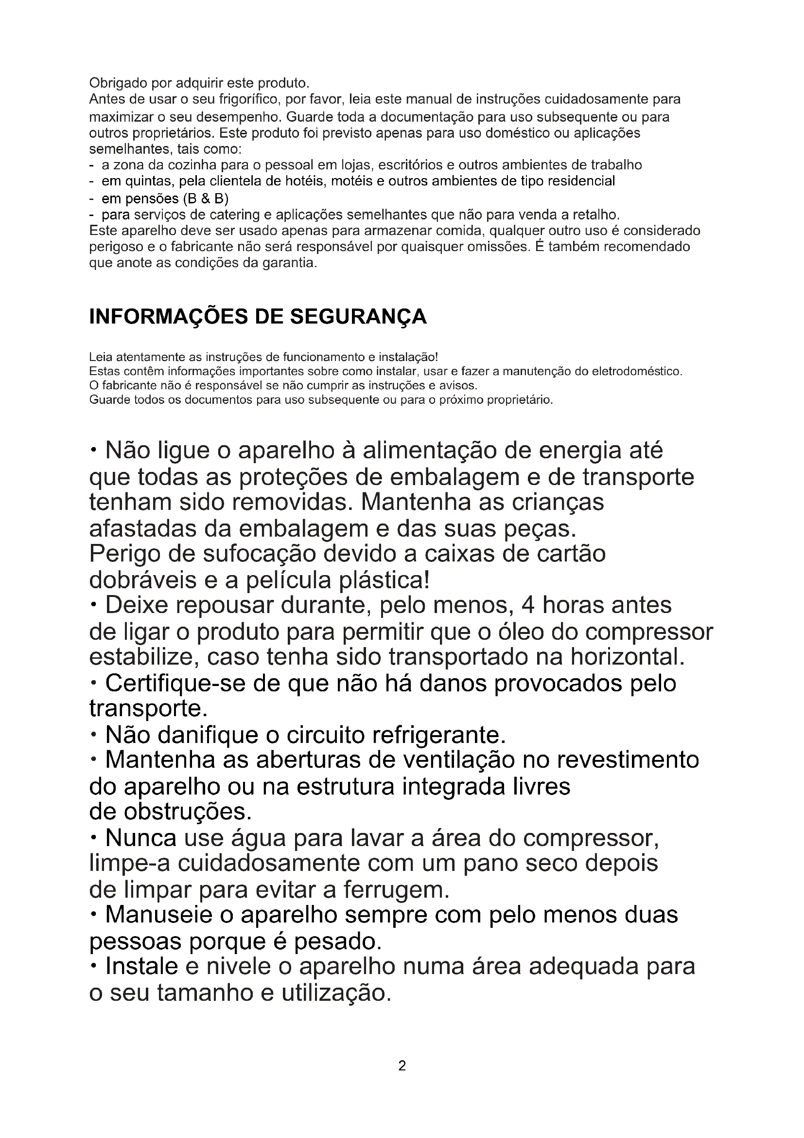 Obrigado por adquirir este produto. Antes de usar o seu frigorífico, por favor, leia este manual de instruções cuidadosamente para maximizar o seu desempenho. Guarde toda a documentação para uso subsequente ou para outros proprietários. Este produto foi previsto apenas para uso doméstico ou aplicações semelhantes, tais como: - a zona da cozinha para o pessoal em lojas, escritórios e outros ambientes de trabalho - em quintas, pela clientela de hotéis, motéis e outros ambientes de tipo residencial - em pensões (B & B) - para serviços de catering e aplicações semelhantes que não para venda a retalho. Este aparelho deve ser usado apenas para armazenar comida, qualquer outro uso é considerado perigoso e o fabricante não será responsável por quaisquer omissões. É também recomendado que anote as condições da garantia.