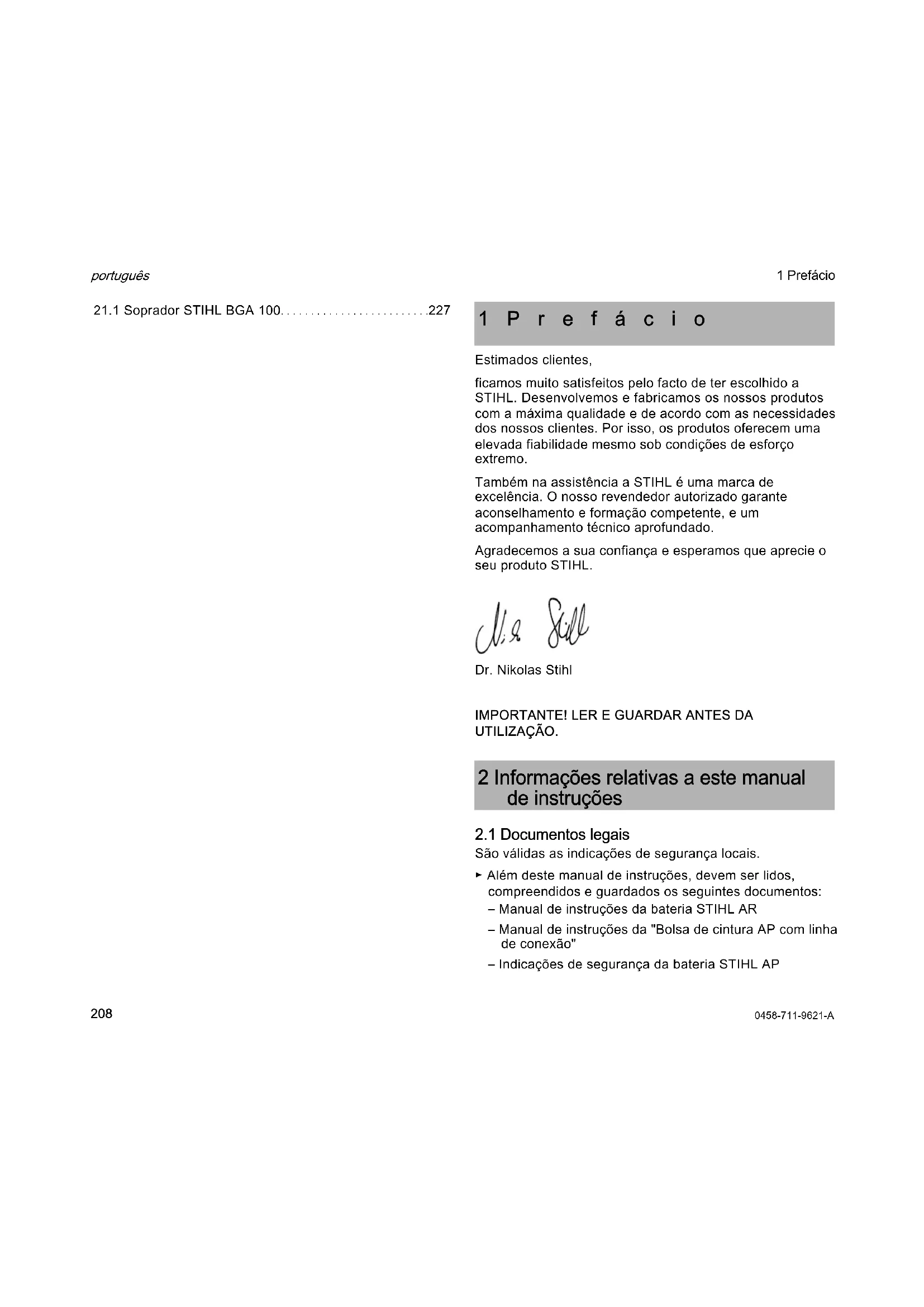 1Prefácio 2 Informações relativas a este manual de instruções0458-711-9621-A